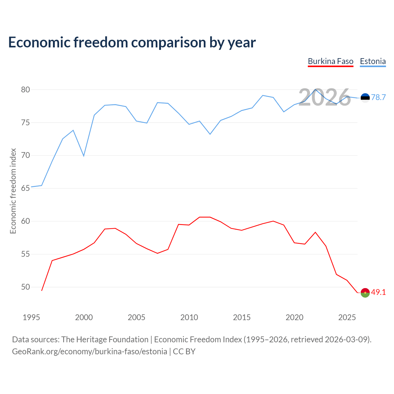 The Economic Freedom Index for Burkina Faso is 49.1, ranking 167/197, compared to 78.7 for Estonia, ranking 10/197. The chart above displays a comparison of annual changes in economic freedom indexes.
