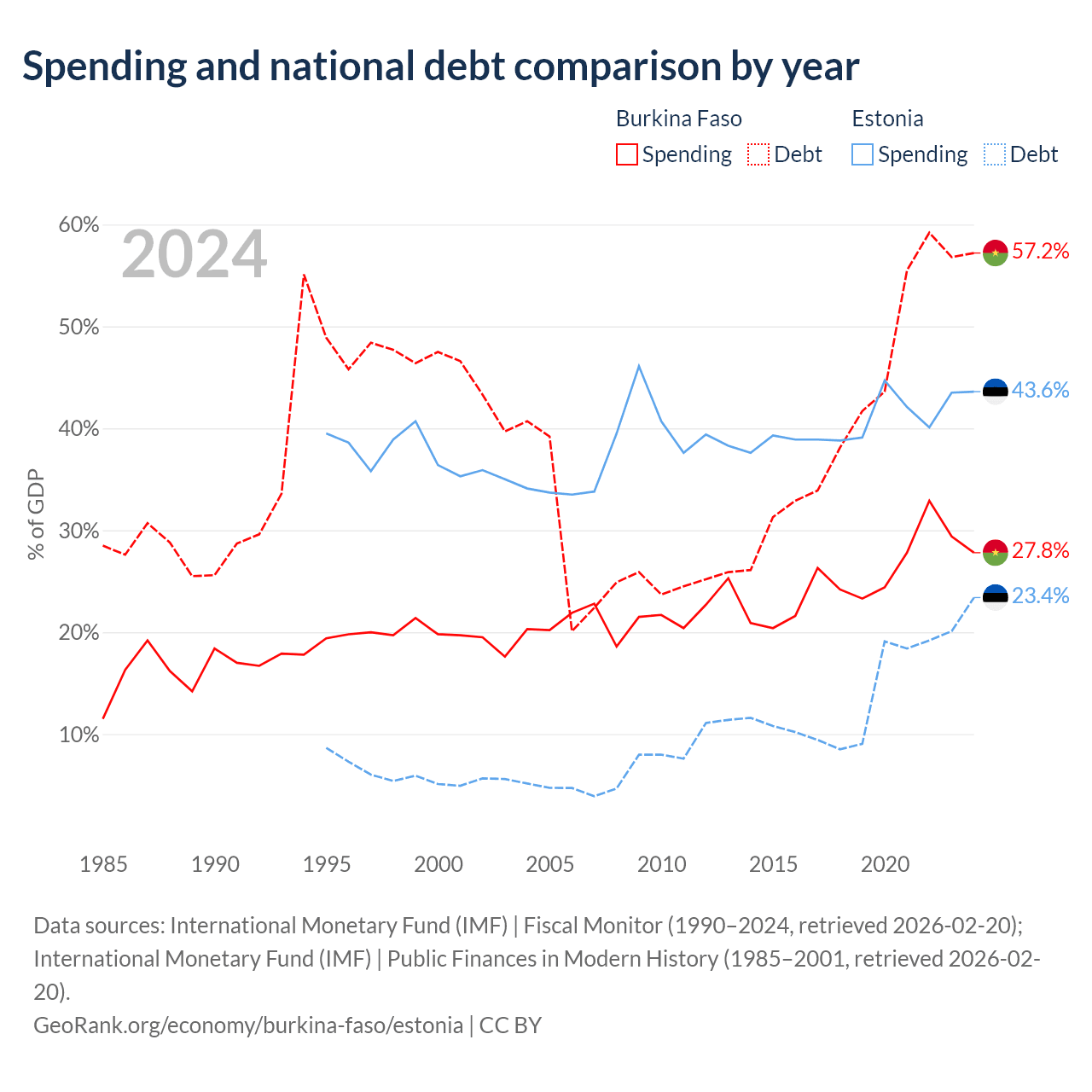 Burkina Faso has $13.2B in government debt (57.2% of GDP), compared to $10.1B (23.4% of GDP) in Estonia.