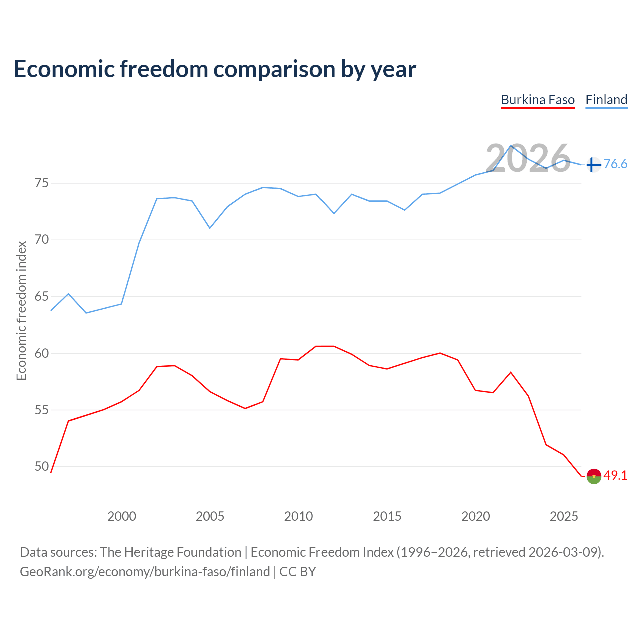 The Economic Freedom Index for Burkina Faso is 49.1, ranking 167/197, compared to 76.6 for Finland, ranking 15/197. The chart above displays a comparison of annual changes in economic freedom indexes.