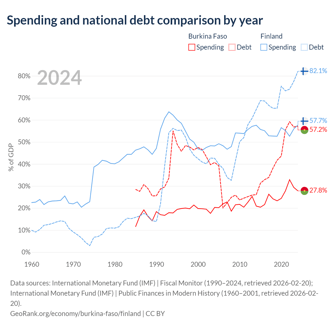 Burkina Faso has $13.2B in government debt (57.2% of GDP), compared to $245B (82.1% of GDP) in Finland.