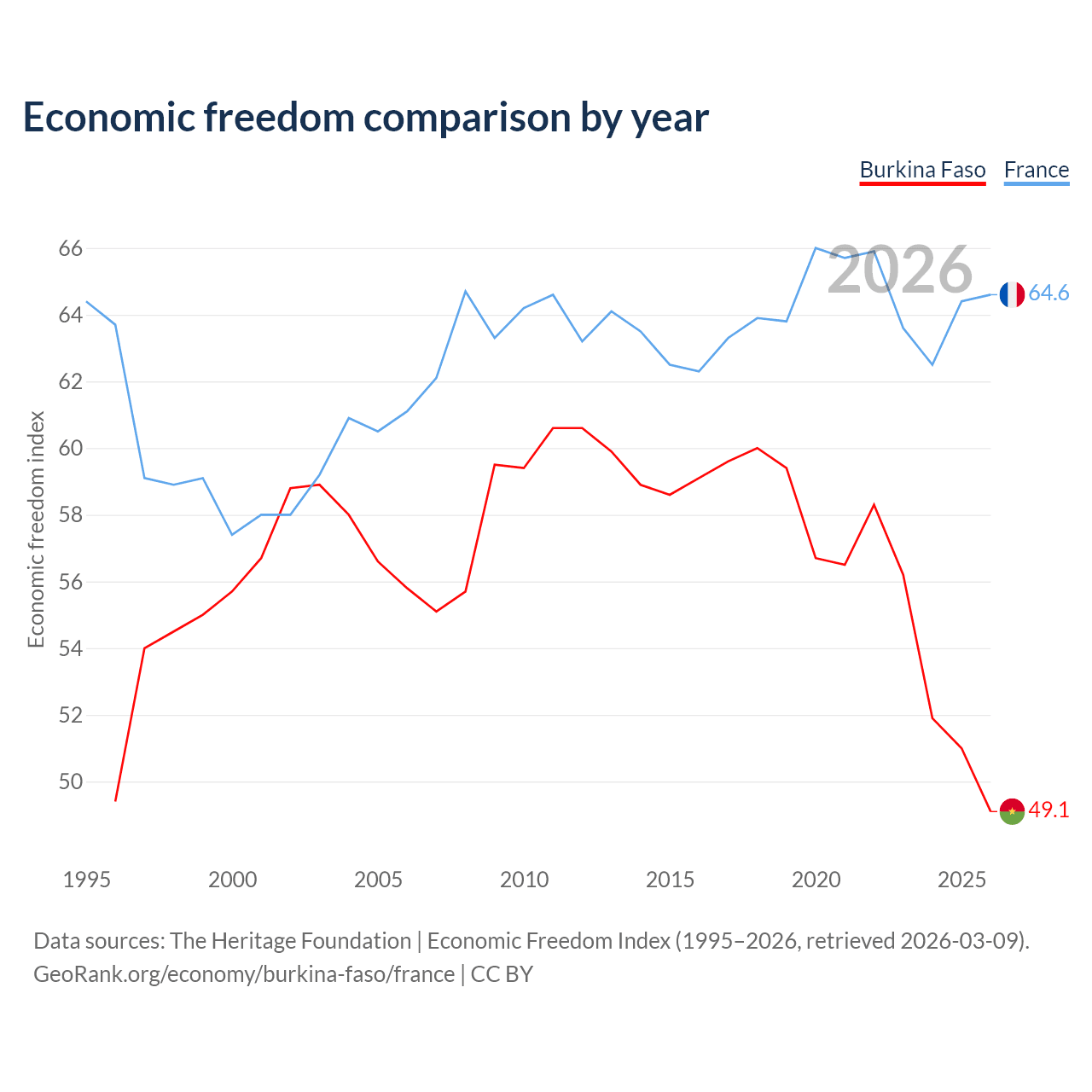 The Economic Freedom Index for Burkina Faso is 49.1, ranking 167/197, compared to 64.6 for France, ranking 72/197. The chart above displays a comparison of annual changes in economic freedom indexes.