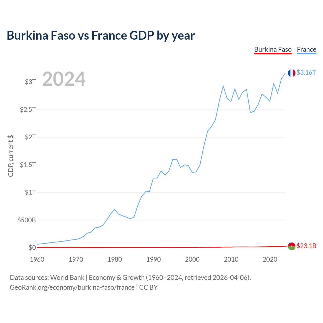 Burkina Faso has a GDP of $23.1B compared to $3.16T for France, ranking 122/197 and 7/197 by economy size, respectively.