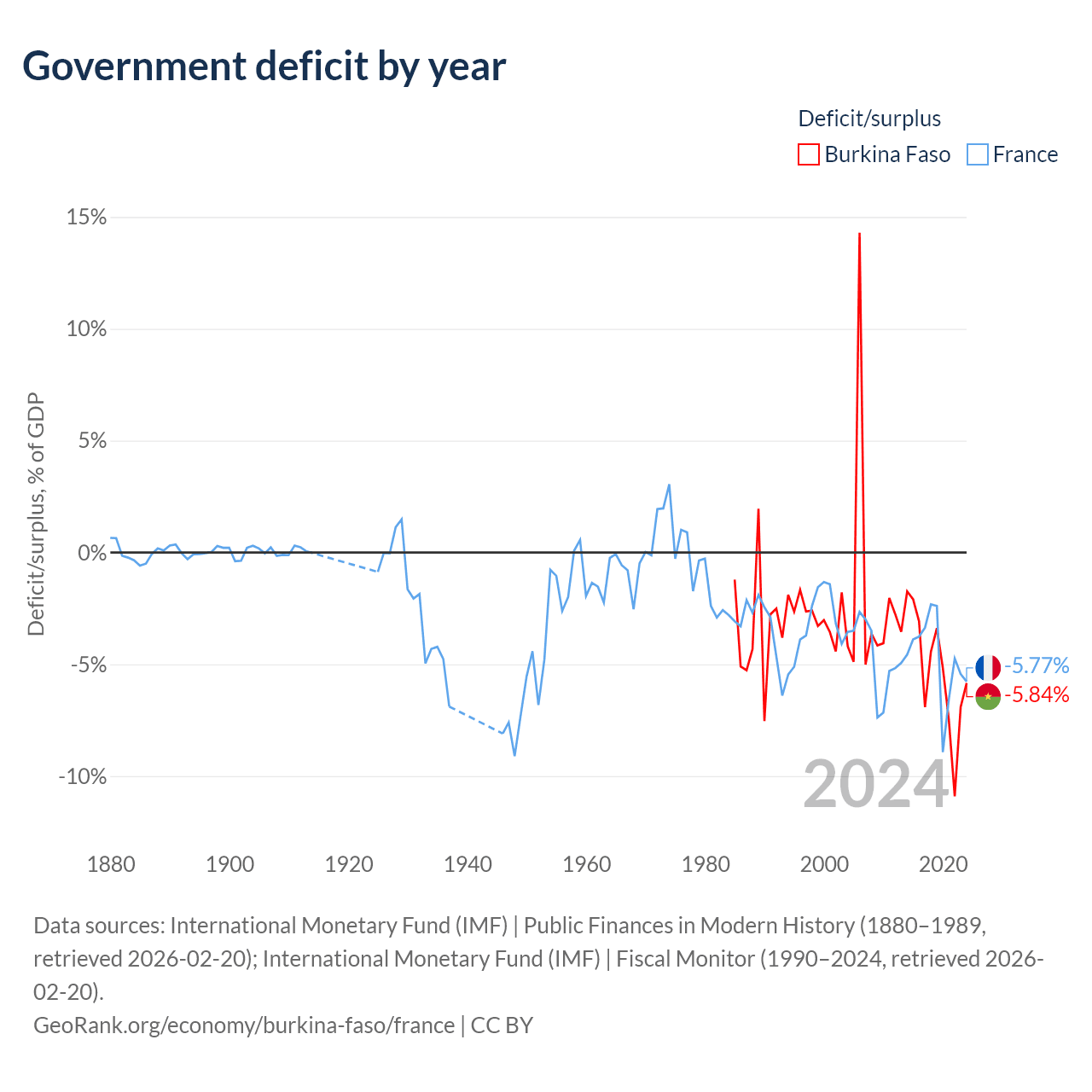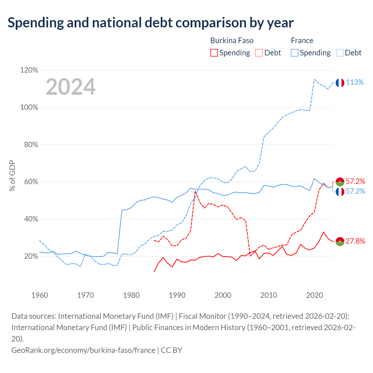 Burkina Faso has $13.2B in government debt (57.2% of GDP), compared to $3.58T (113.1% of GDP) in France.