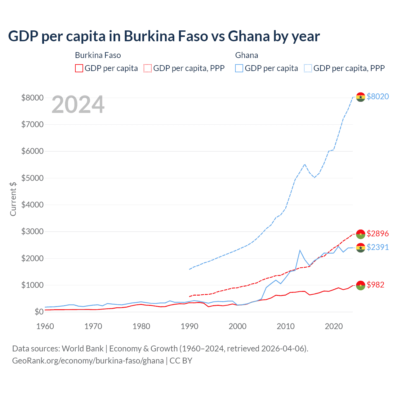 GDP per capita in Burkina Faso vs Ghana by year