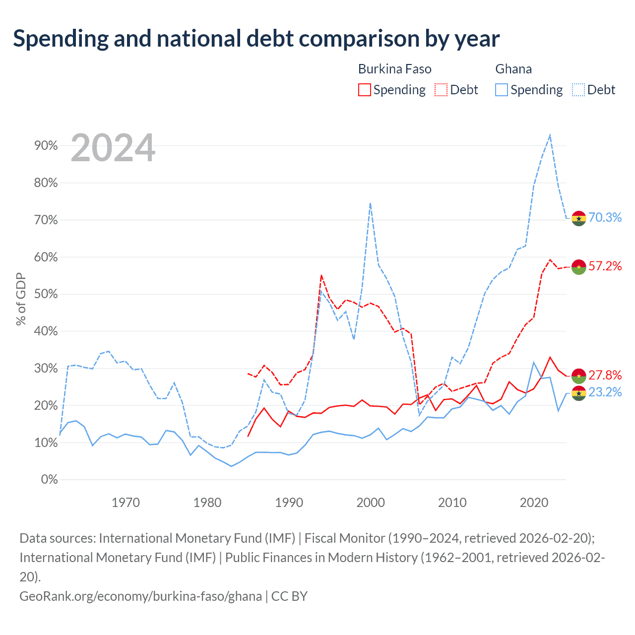 Burkina Faso has $13.2B in government debt (57.2% of GDP), compared to $57.9B (70.3% of GDP) in Ghana.