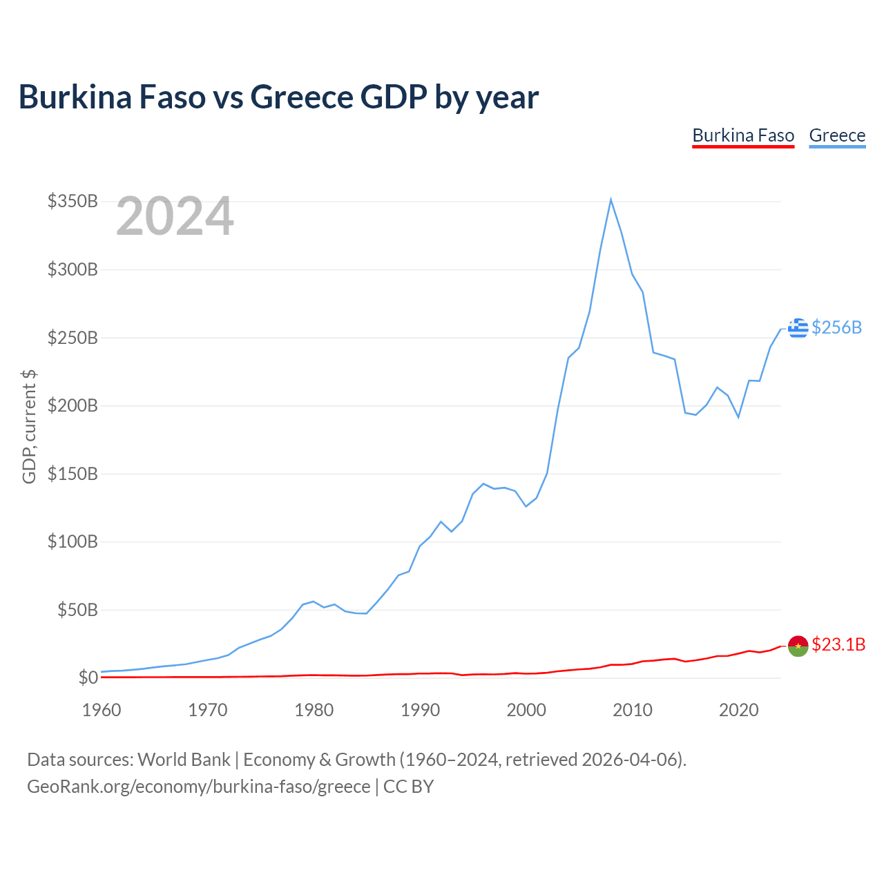 Burkina Faso has a GDP of $23.1B compared to $256B for Greece, ranking 122/197 and 53/197 by economy size, respectively.