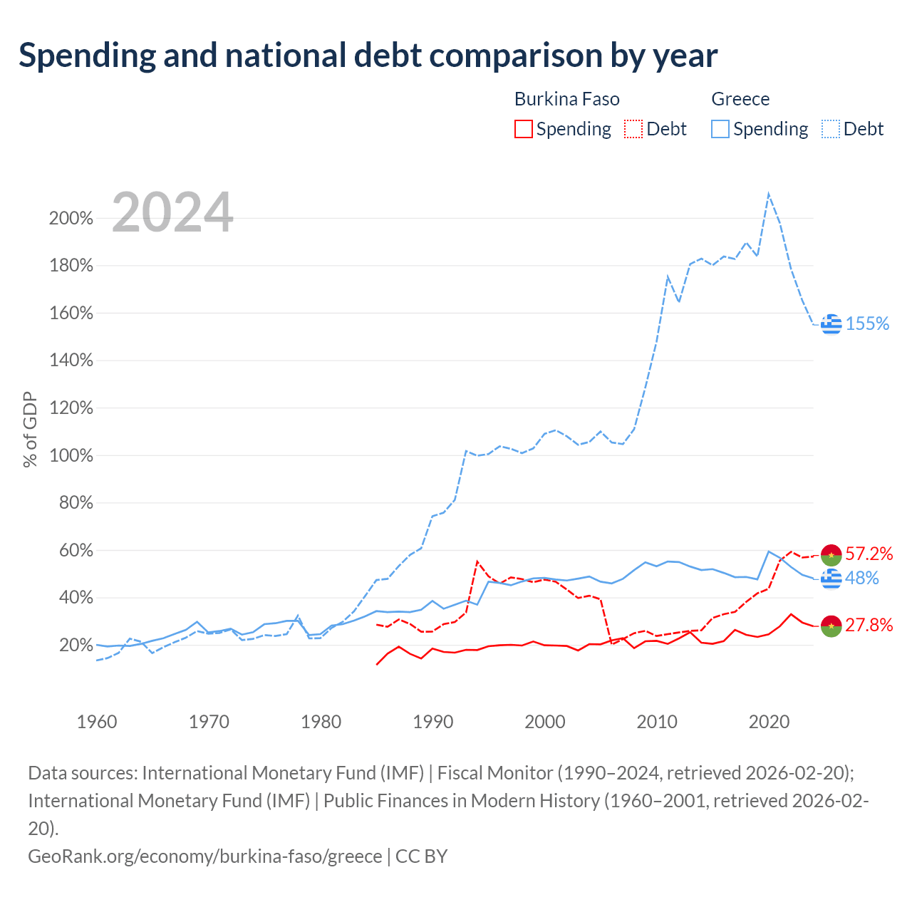 Burkina Faso has $13.2B in government debt (57.2% of GDP), compared to $397B (154.8% of GDP) in Greece.