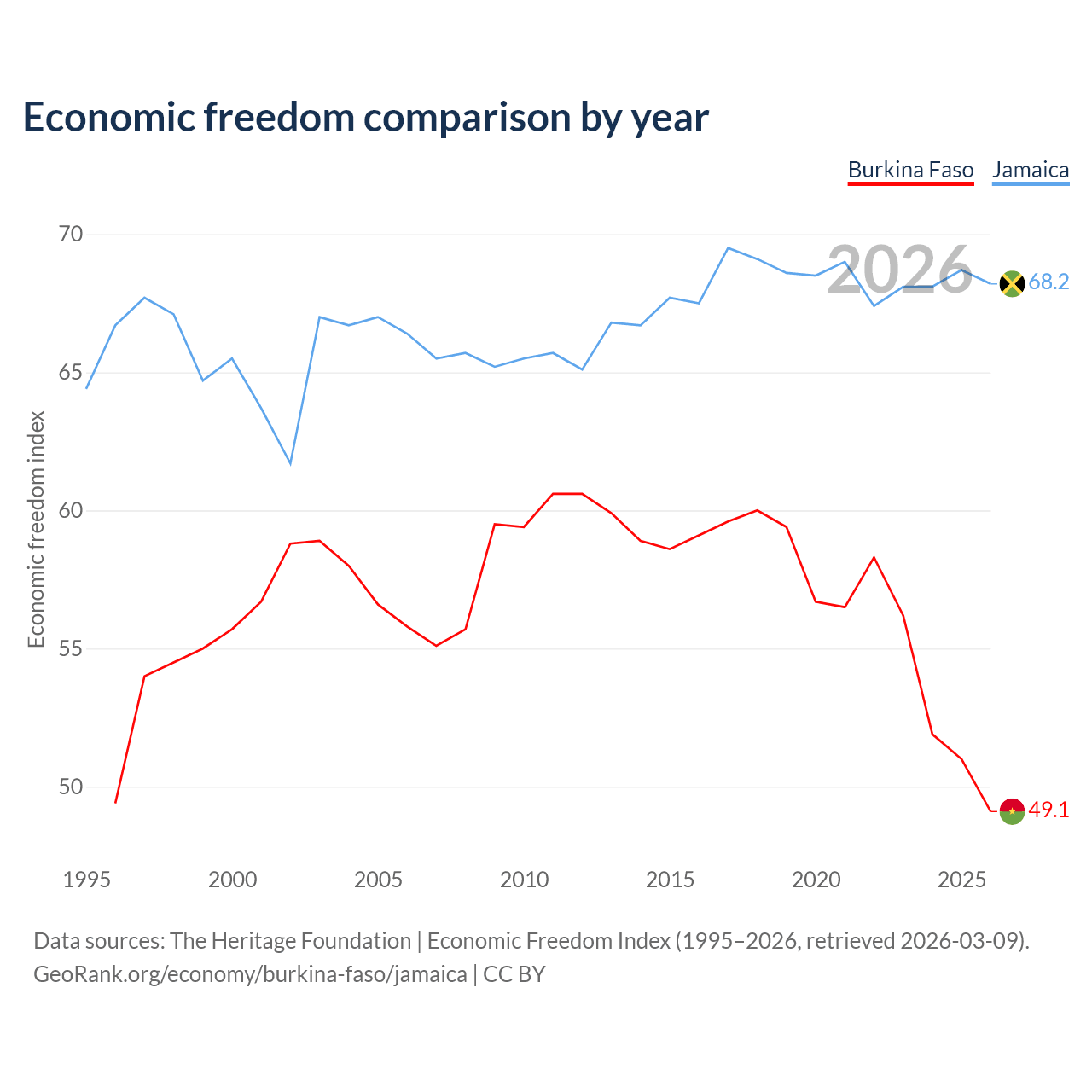 The Economic Freedom Index for Burkina Faso is 49.1, ranking 167/197, compared to 68.2 for Jamaica, ranking 48/197. The chart above displays a comparison of annual changes in economic freedom indexes.