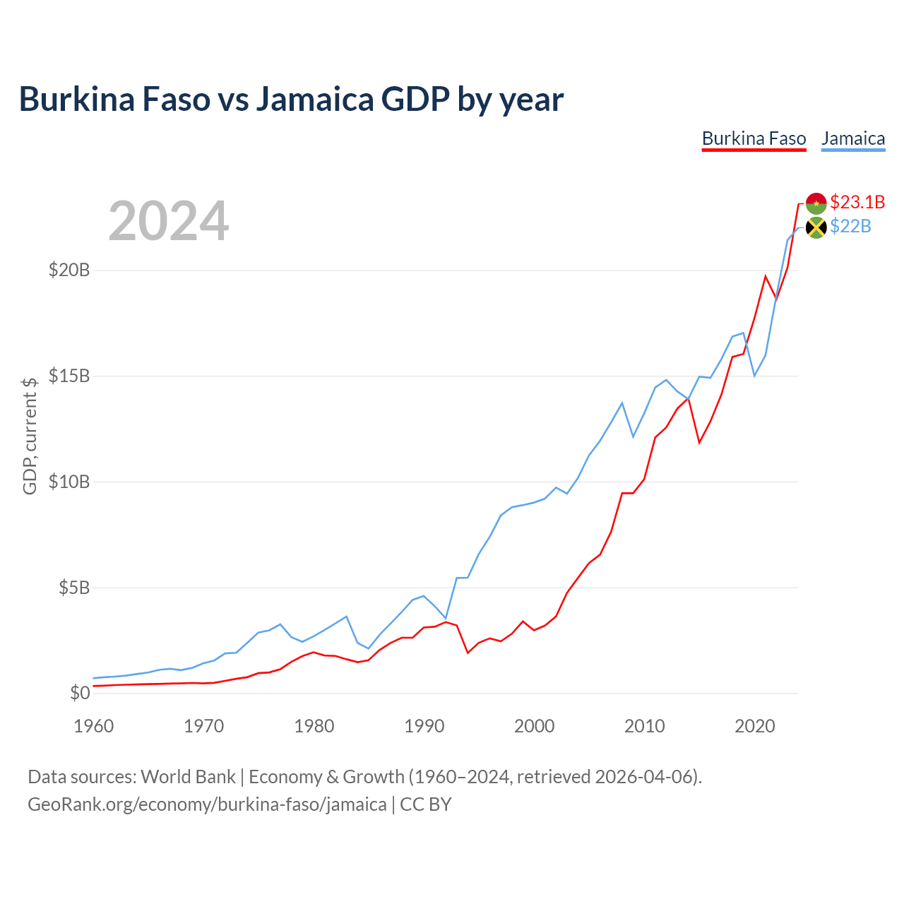 Burkina Faso vs Jamaica GDP by year