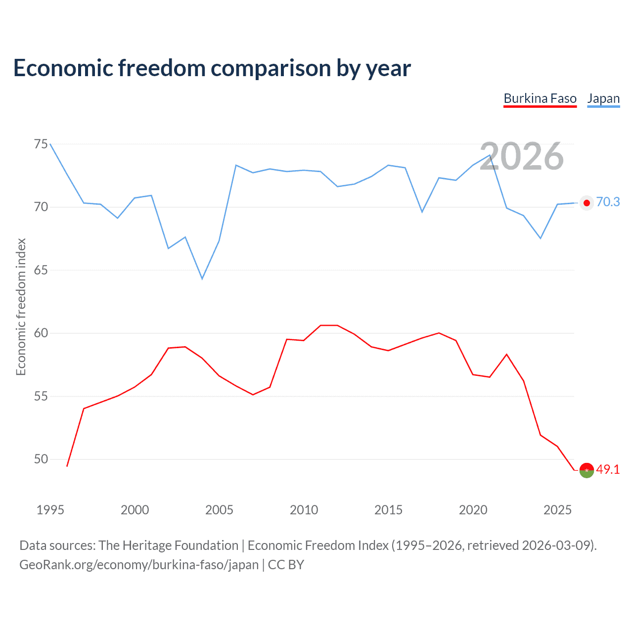 The Economic Freedom Index for Burkina Faso is 49.1, ranking 167/197, compared to 70.3 for Japan, ranking 36/197. The chart above displays a comparison of annual changes in economic freedom indexes.