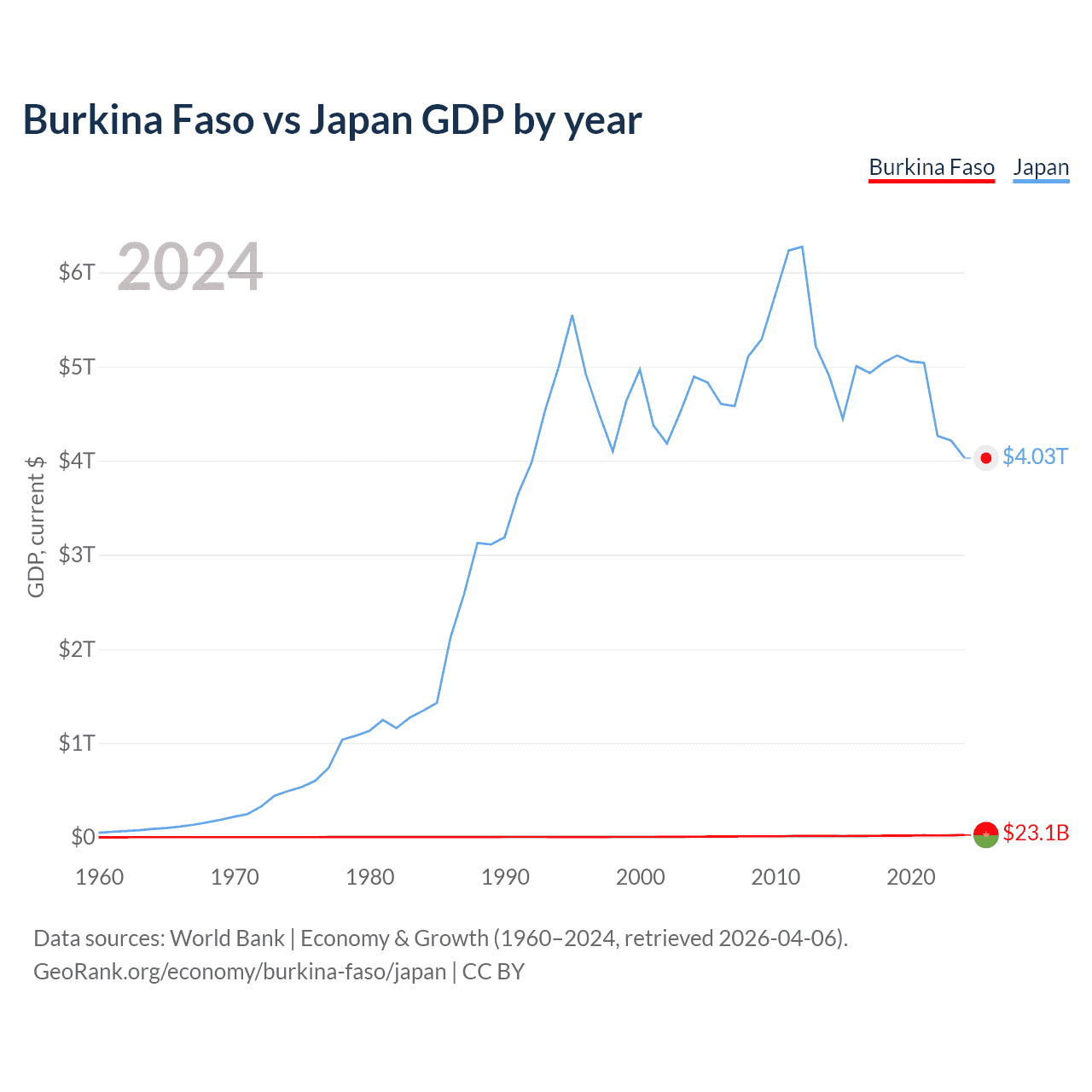 Burkina Faso has a GDP of $23.1B compared to $4.03T for Japan, ranking 122/197 and 4/197 by economy size, respectively.