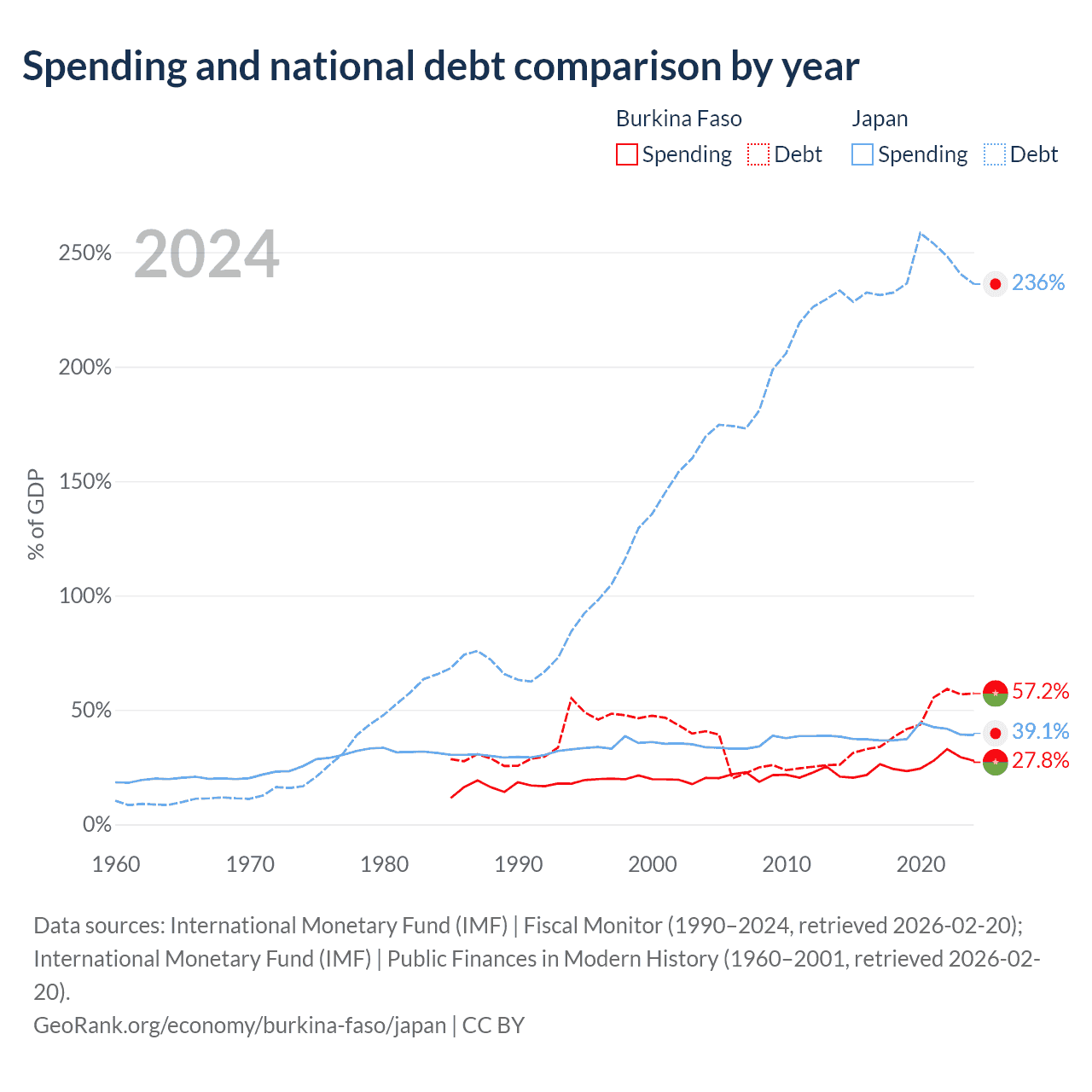 Burkina Faso has $13.2B in government debt (57.2% of GDP), compared to $9.51T (236.1% of GDP) in Japan.