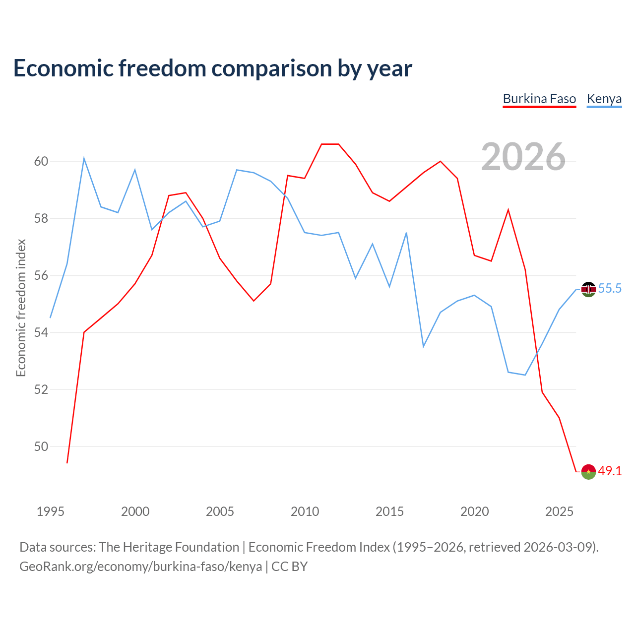 The Economic Freedom Index for Burkina Faso is 49.1, ranking 167/197, compared to 55.5 for Kenya, ranking 128/197. The chart above displays a comparison of annual changes in economic freedom indexes.