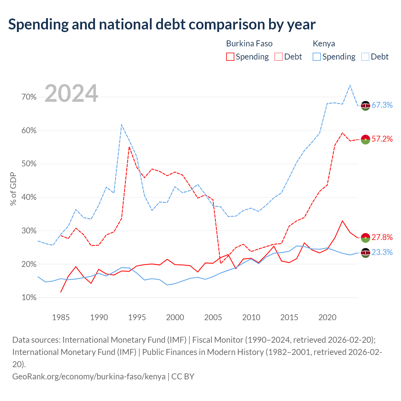 Burkina Faso has $13.2B in government debt (57.2% of GDP), compared to $81B (67.3% of GDP) in Kenya.