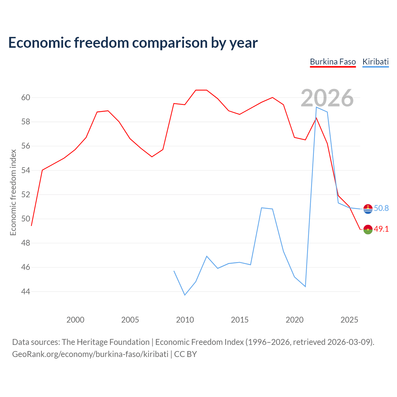 The Economic Freedom Index for Burkina Faso is 49.1, ranking 167/197, compared to 50.8 for Kiribati, ranking 158/197. The chart above displays a comparison of annual changes in economic freedom indexes.