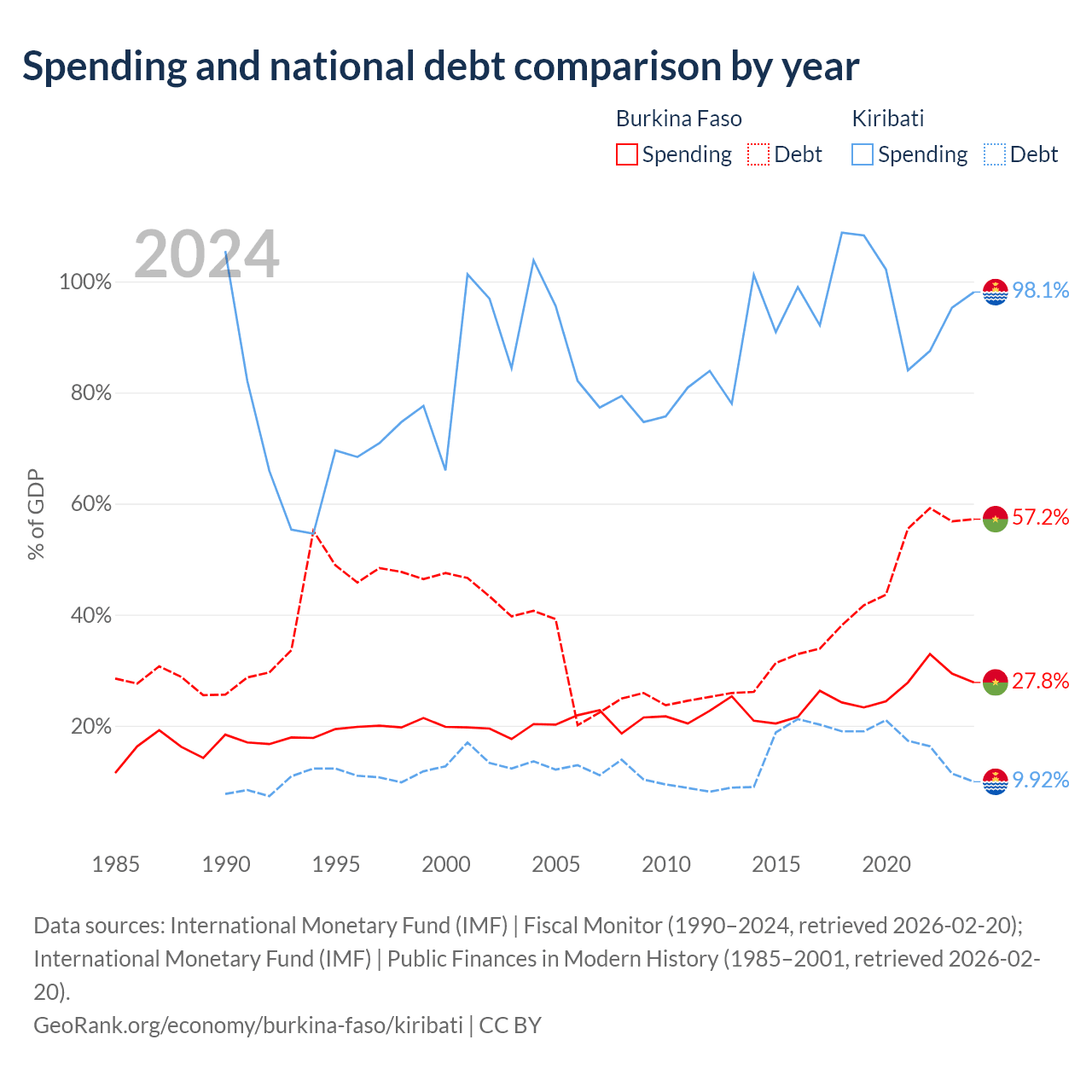 Burkina Faso has $13.2B in government debt (57.2% of GDP), compared to $30.5M (9.92% of GDP) in Kiribati.