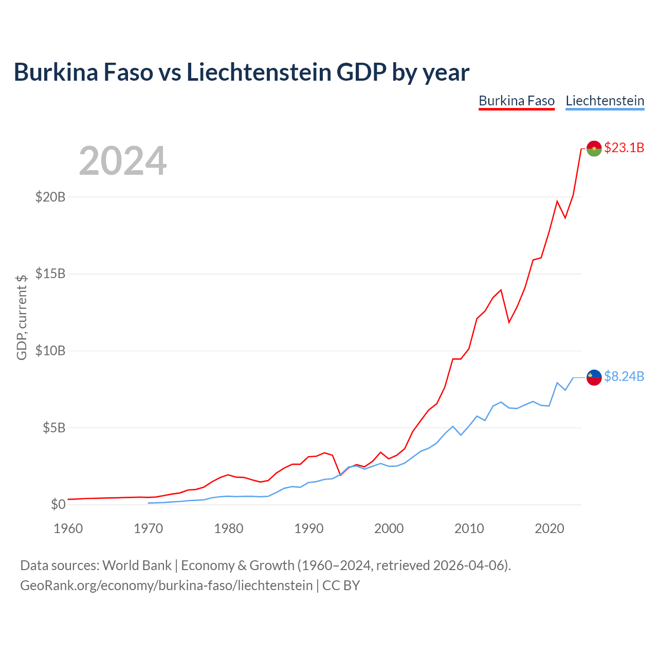 Burkina Faso has a GDP of $23.1B compared to $8.24B for Liechtenstein, ranking 122/197 and 156/197 by economy size, respectively.