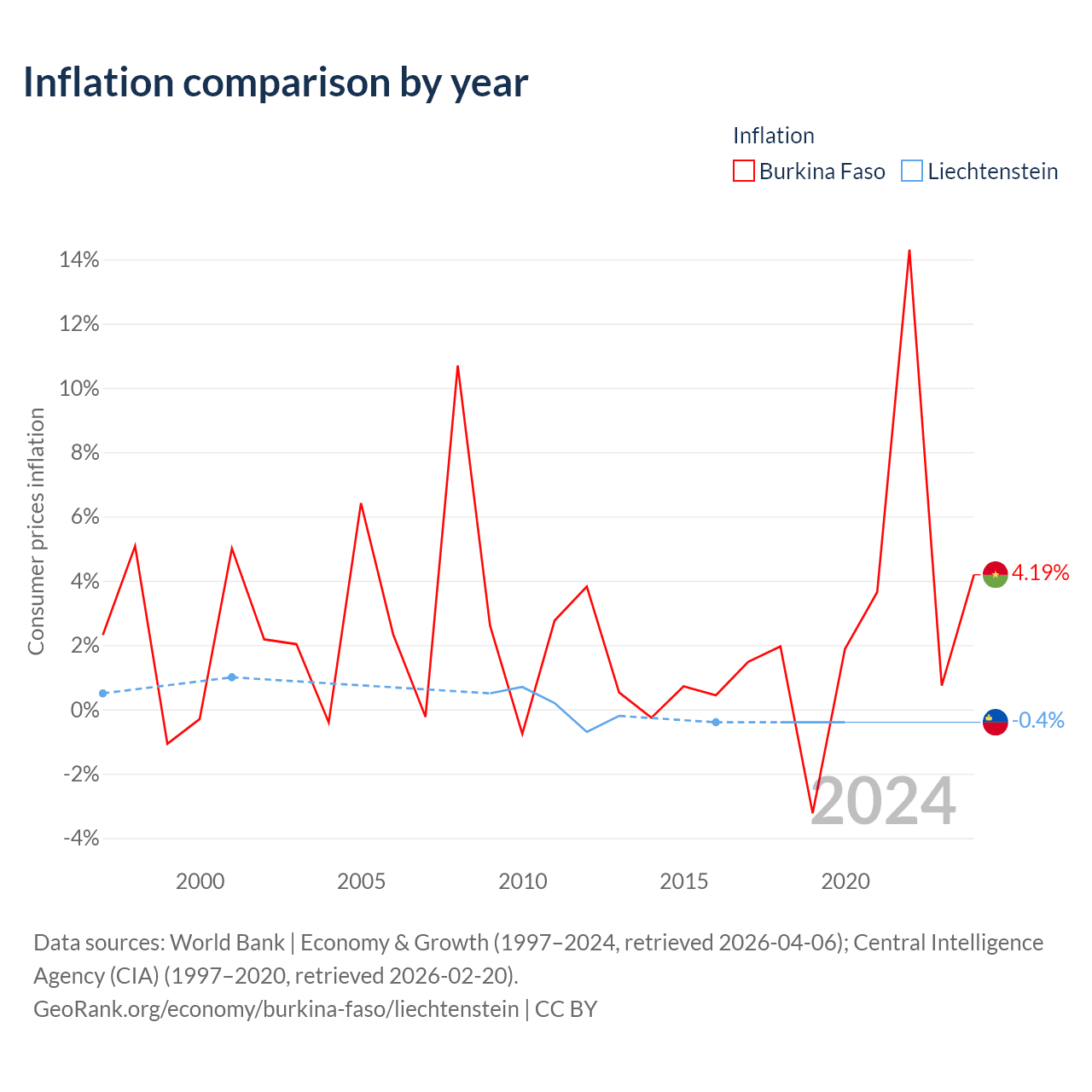 Over the past 24 years, Burkina Faso has recorded an average annual inflation rate of 1.92%, compared with 0.04% in Liechtenstein. In 2020, inflation was 4.19% in Burkina Faso and -0.4% in Liechtenstein.