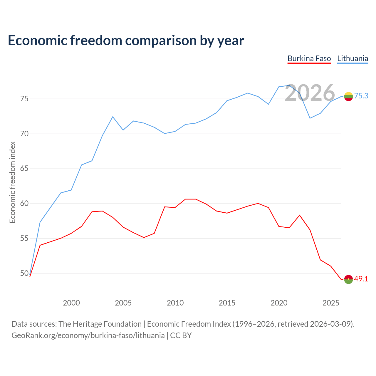 The Economic Freedom Index for Burkina Faso is 49.1, ranking 167/197, compared to 75.3 for Lithuania, ranking 18/197. The chart above displays a comparison of annual changes in economic freedom indexes.