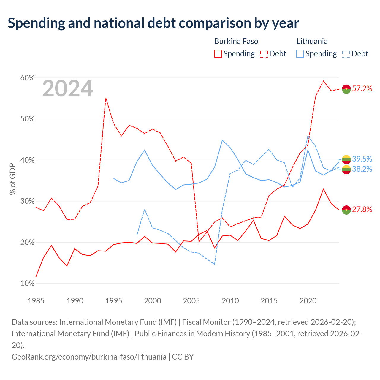 Burkina Faso has $13.2B in government debt (57.2% of GDP), compared to $32.4B (38.2% of GDP) in Lithuania.