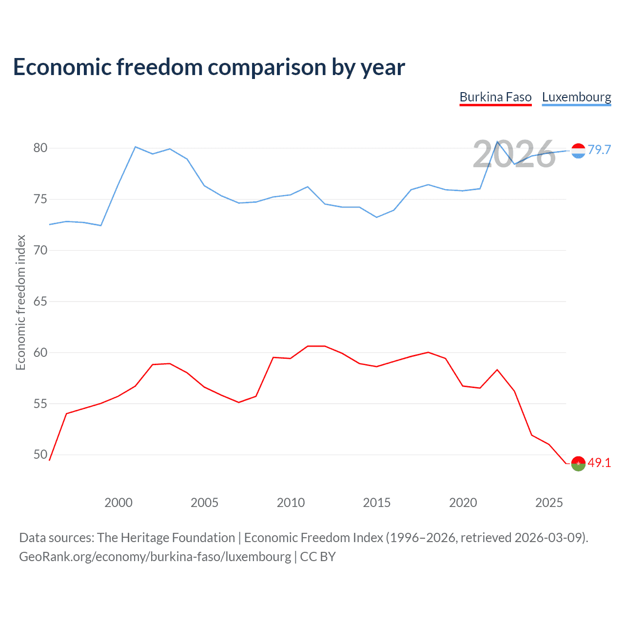 The Economic Freedom Index for Burkina Faso is 49.1, ranking 167/197, compared to 79.7 for Luxembourg, ranking 7/197. The chart above displays a comparison of annual changes in economic freedom indexes.