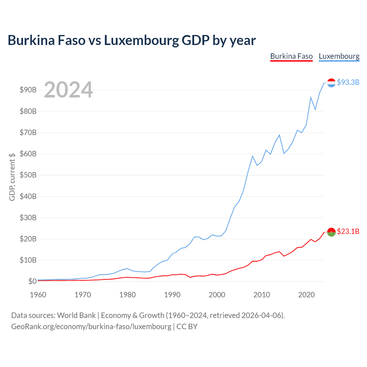 Burkina Faso has a GDP of $23.1B compared to $93.3B for Luxembourg, ranking 122/197 and 74/197 by economy size, respectively.