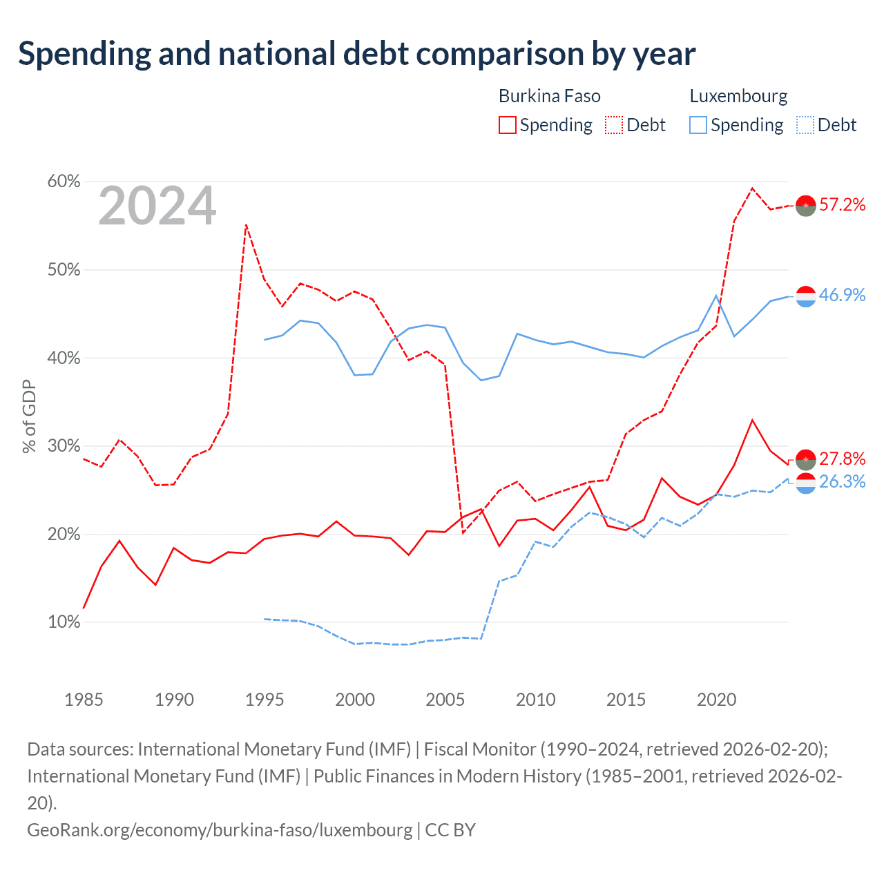 Burkina Faso has $13.2B in government debt (57.2% of GDP), compared to $24.5B (26.3% of GDP) in Luxembourg.
