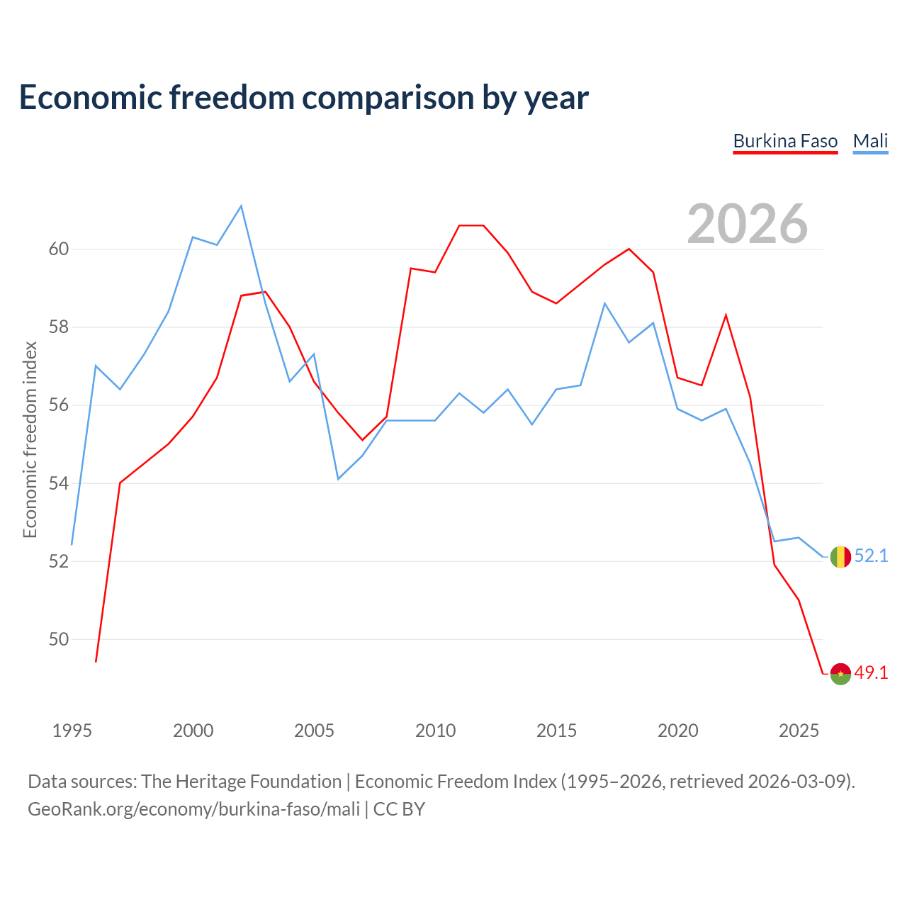 The Economic Freedom Index for Burkina Faso is 49.1, ranking 167/197, compared to 52.1 for Mali, ranking 150/197. The chart above displays a comparison of annual changes in economic freedom indexes.