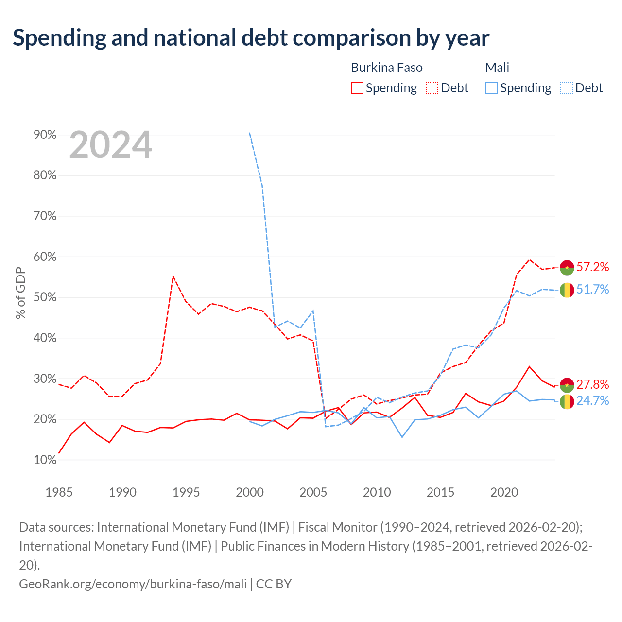 Burkina Faso has $13.2B in government debt (57.2% of GDP), compared to $13.9B (51.7% of GDP) in Mali.
