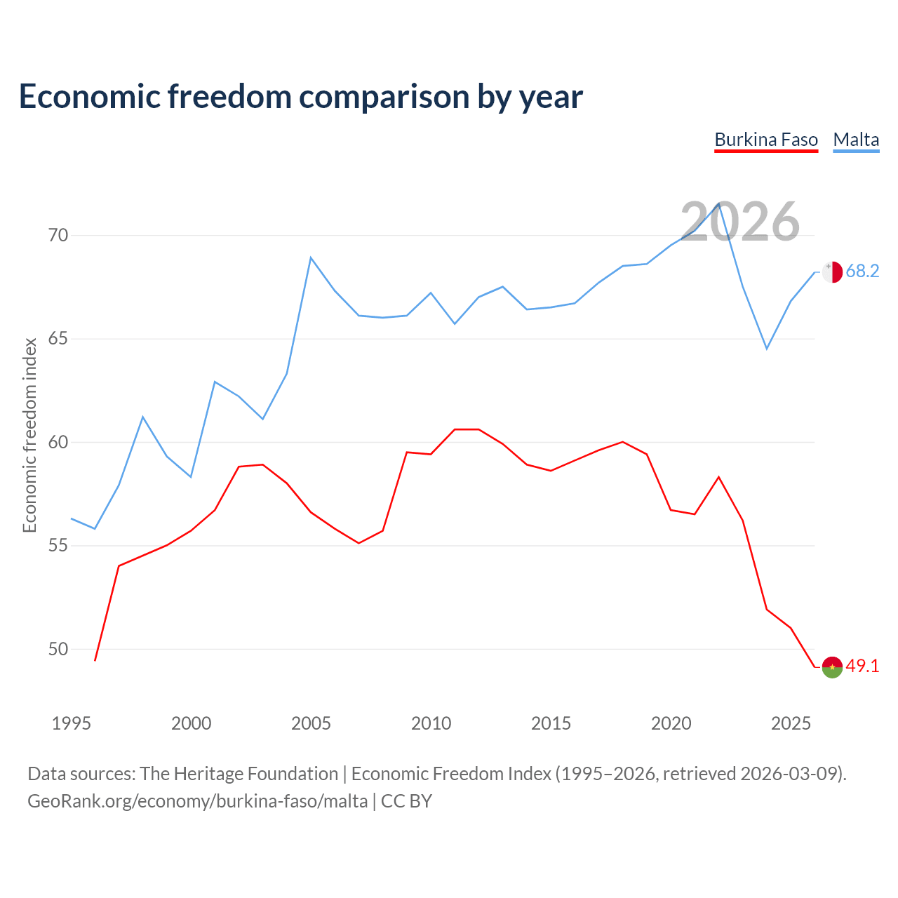 The Economic Freedom Index for Burkina Faso is 49.1, ranking 167/197, compared to 68.2 for Malta, ranking 49/197. The chart above displays a comparison of annual changes in economic freedom indexes.