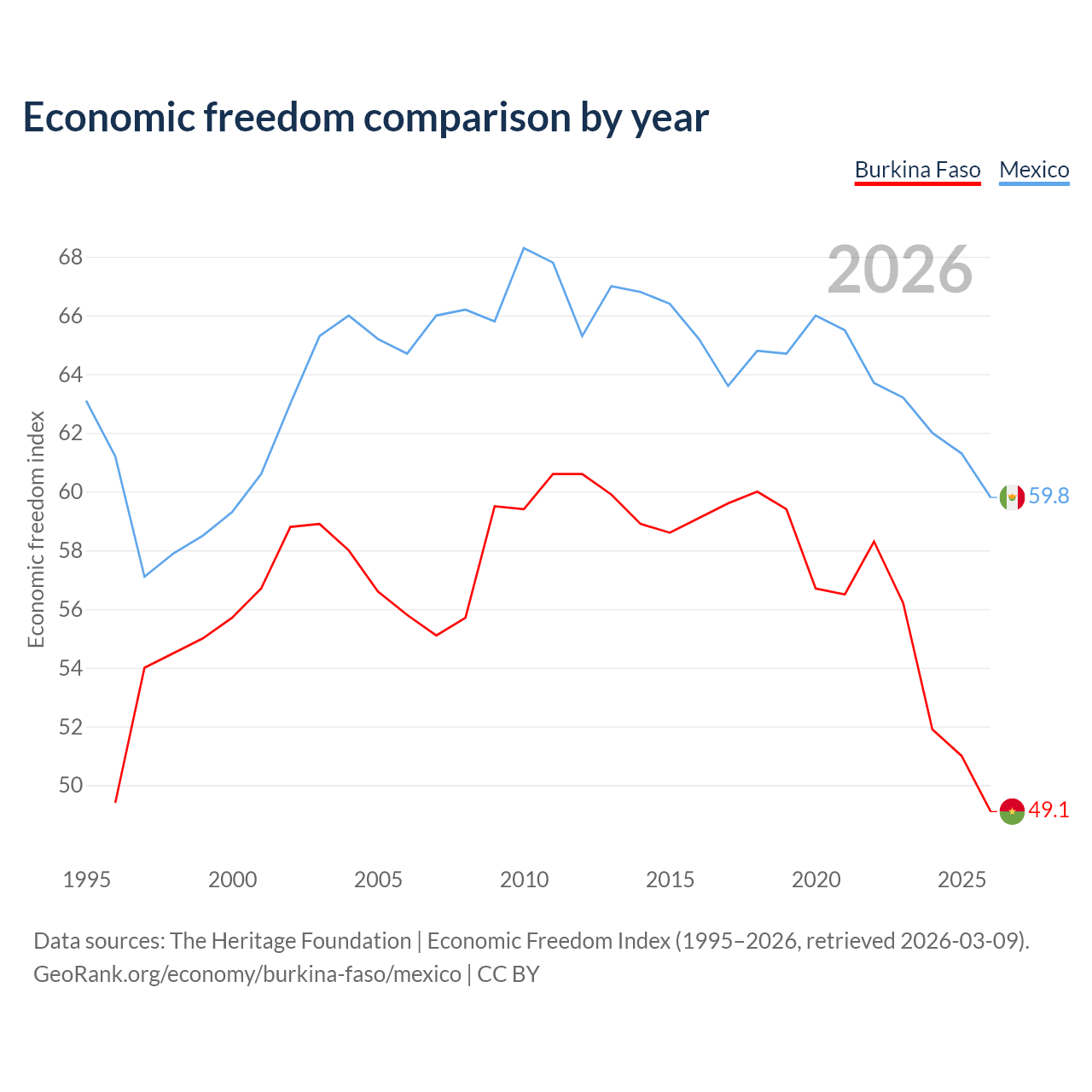 The Economic Freedom Index for Burkina Faso is 49.1, ranking 167/197, compared to 59.8 for Mexico, ranking 102/197. The chart above displays a comparison of annual changes in economic freedom indexes.