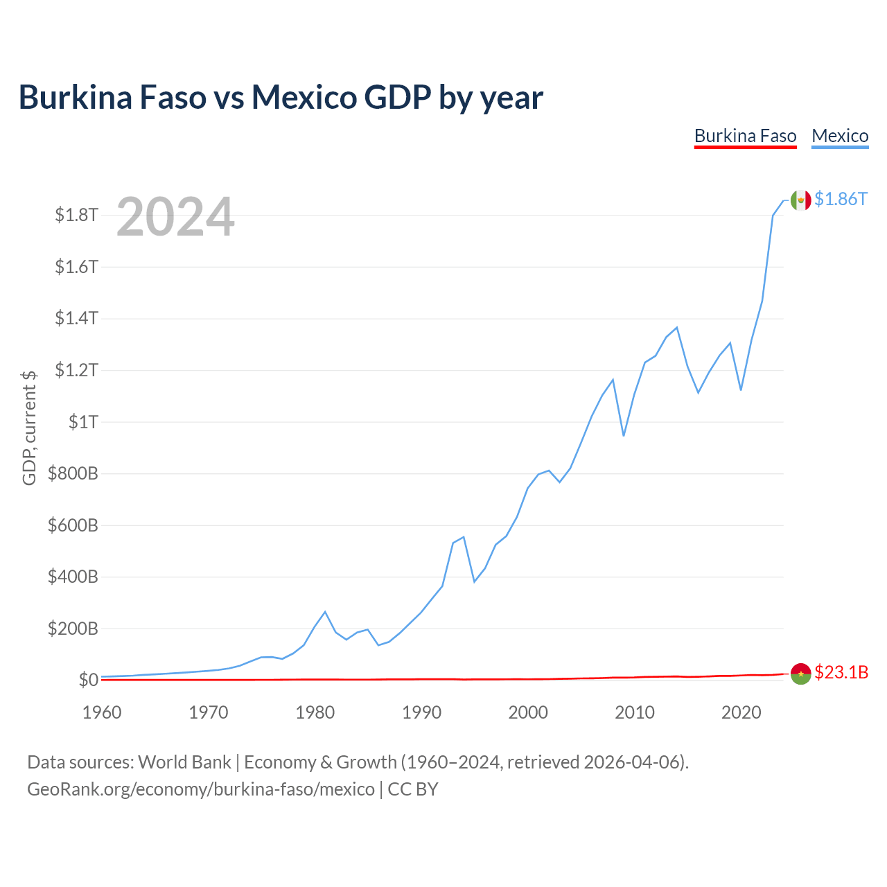 Burkina Faso vs Mexico GDP by year