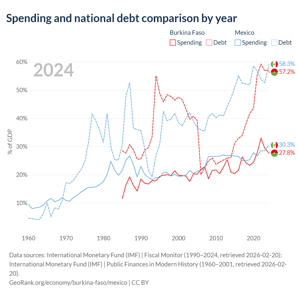 Burkina Faso has $13.2B in government debt (57.2% of GDP), compared to $1.08T (58.3% of GDP) in Mexico.