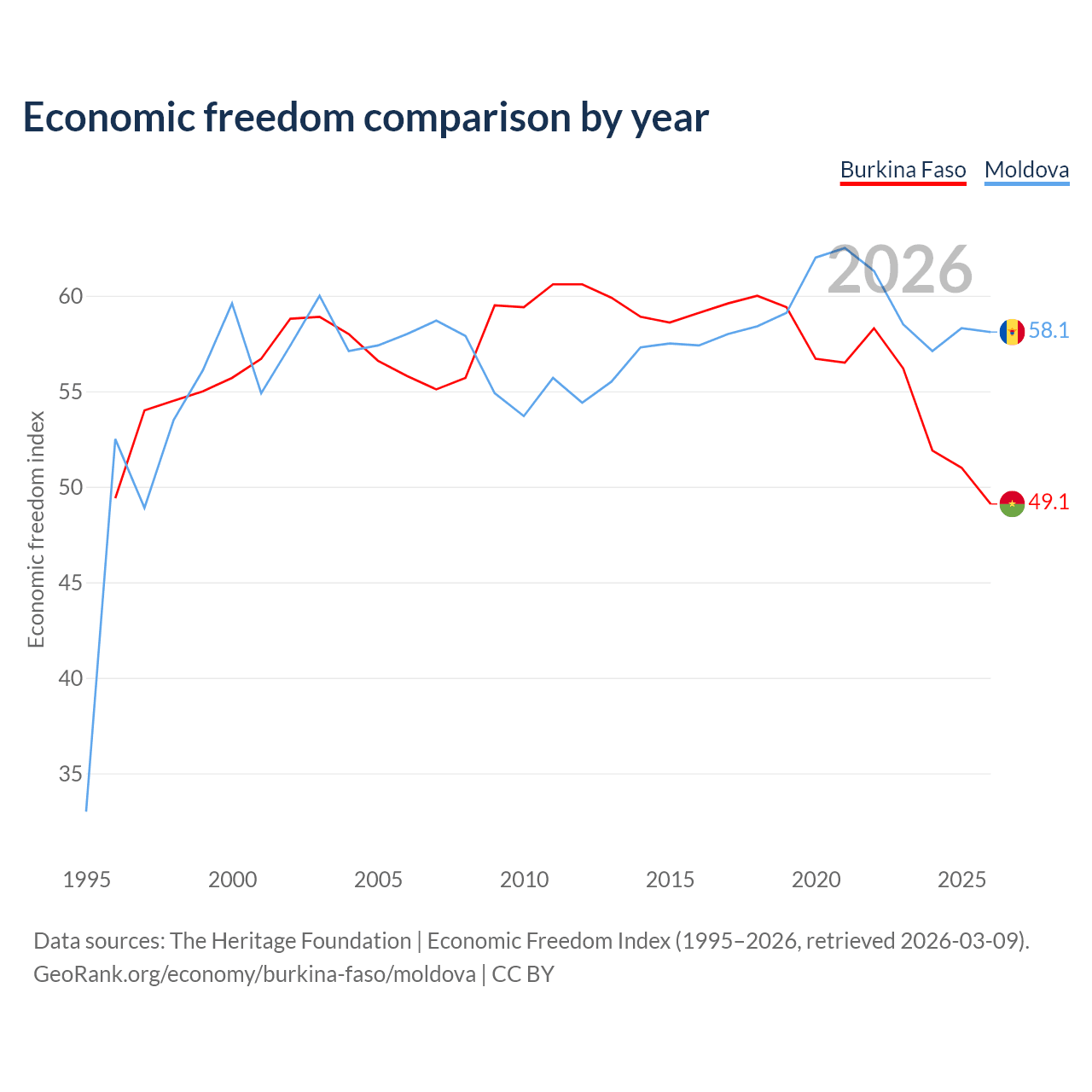 The Economic Freedom Index for Burkina Faso is 49.1, ranking 167/197, compared to 58.1 for Moldova, ranking 112/197. The chart above displays a comparison of annual changes in economic freedom indexes.