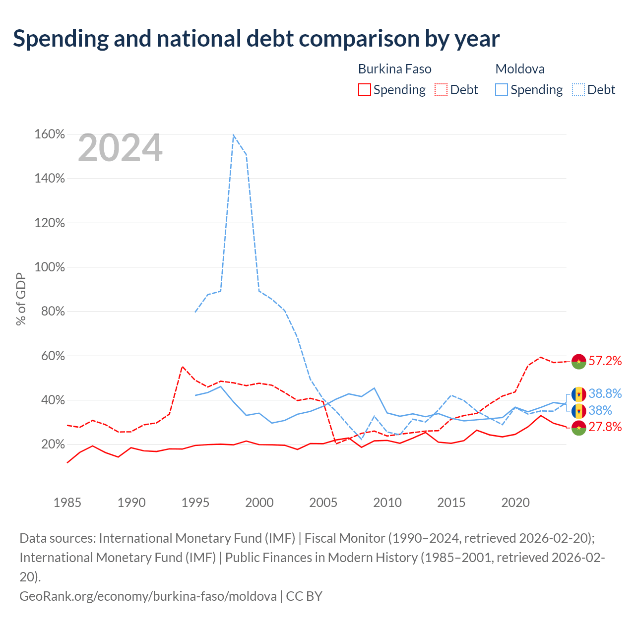 Burkina Faso has $13.2B in government debt (57.2% of GDP), compared to $7.06B (38.8% of GDP) in Moldova.
