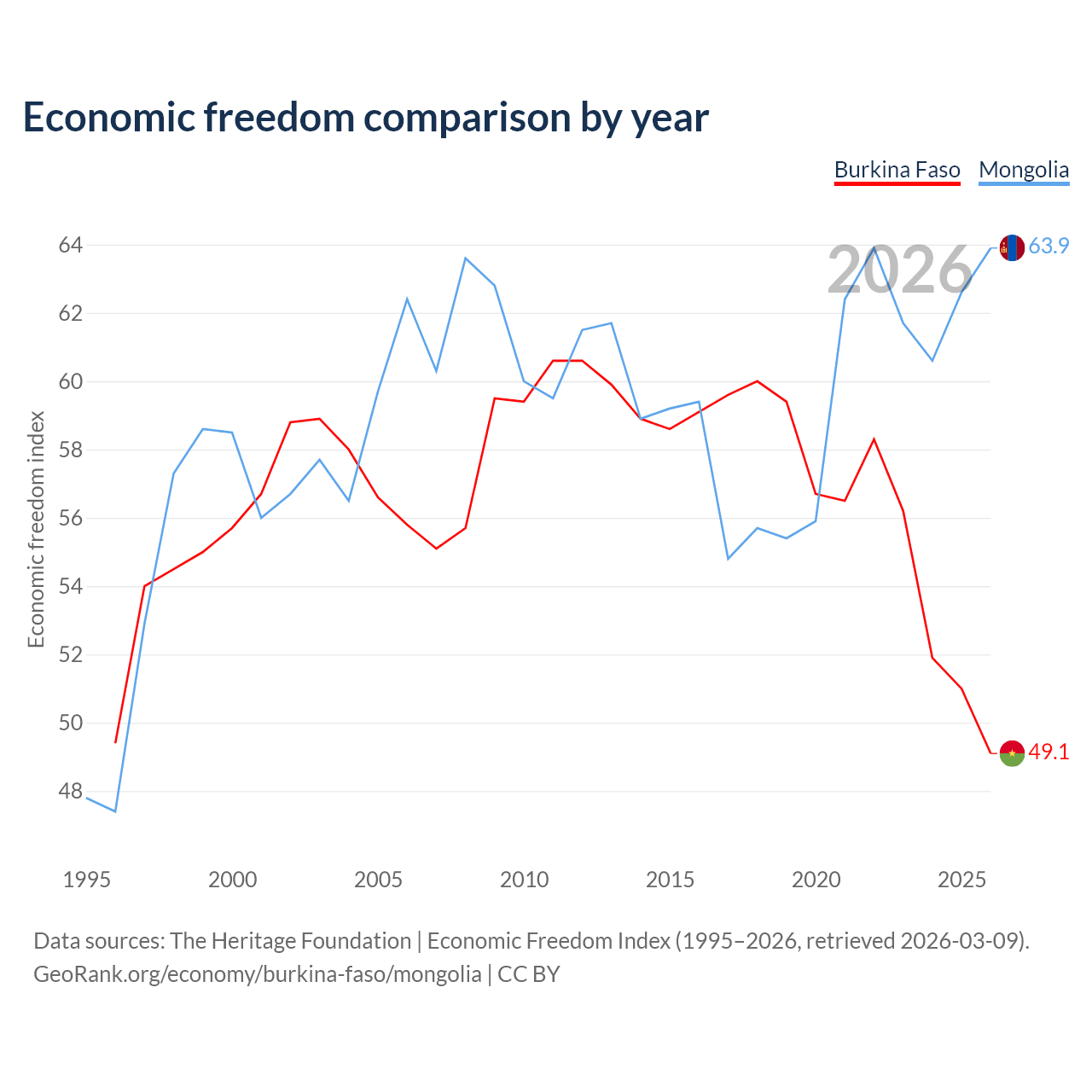 The Economic Freedom Index for Burkina Faso is 49.1, ranking 167/197, compared to 63.9 for Mongolia, ranking 76/197. The chart above displays a comparison of annual changes in economic freedom indexes.