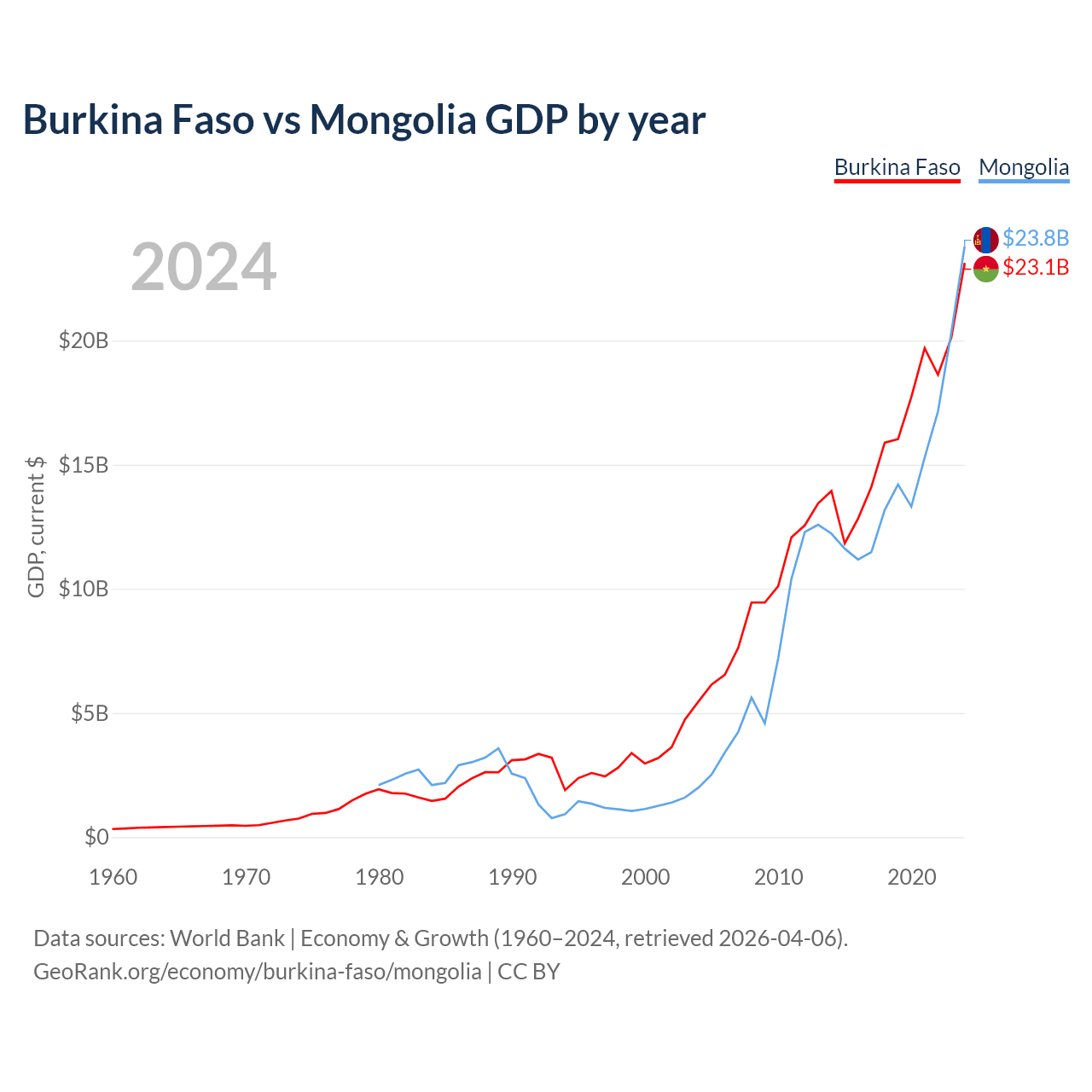 Burkina Faso has a GDP of $23.1B compared to $23.8B for Mongolia, ranking 122/197 and 121/197 by economy size, respectively.
