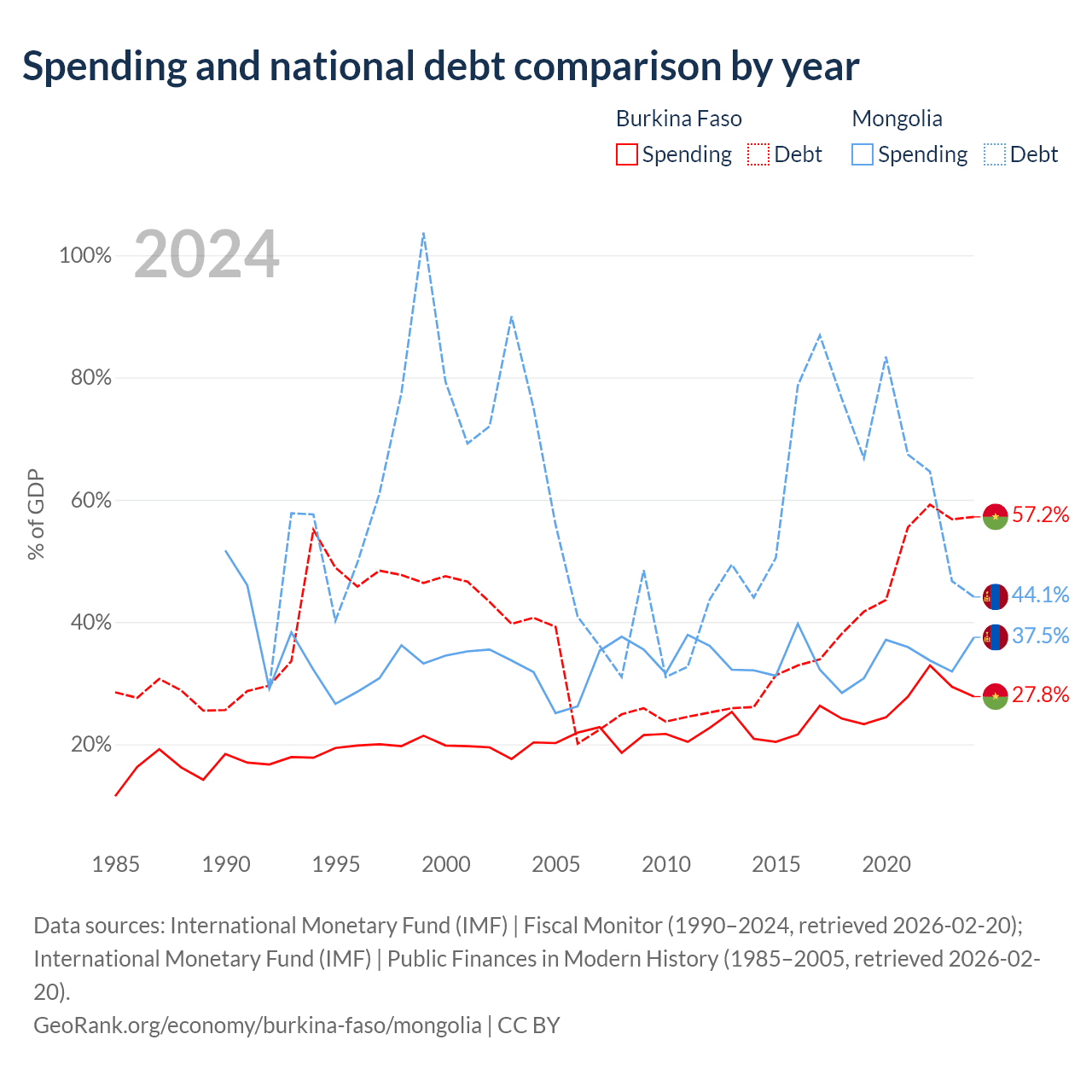 Burkina Faso has $13.2B in government debt (57.2% of GDP), compared to $10.5B (44.1% of GDP) in Mongolia.