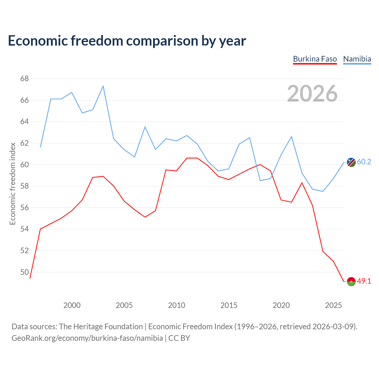 The Economic Freedom Index for Burkina Faso is 49.1, ranking 167/197, compared to 60.2 for Namibia, ranking 95/197. The chart above displays a comparison of annual changes in economic freedom indexes.