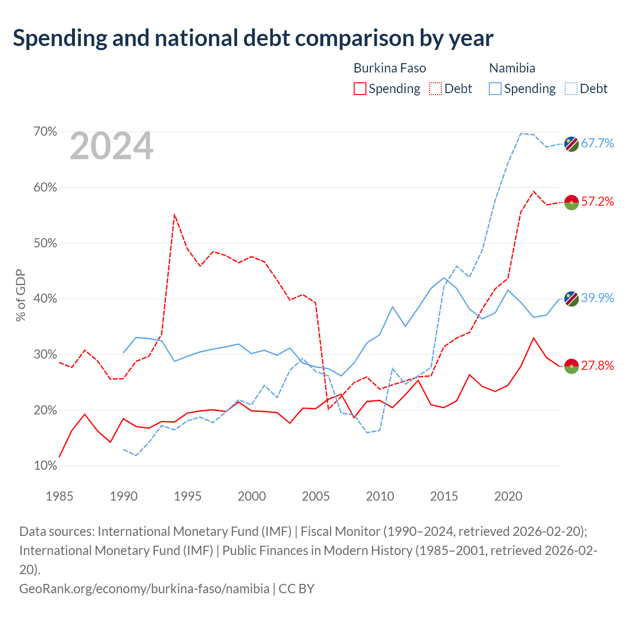 Burkina Faso has $13.2B in government debt (57.2% of GDP), compared to $9.05B (67.7% of GDP) in Namibia.