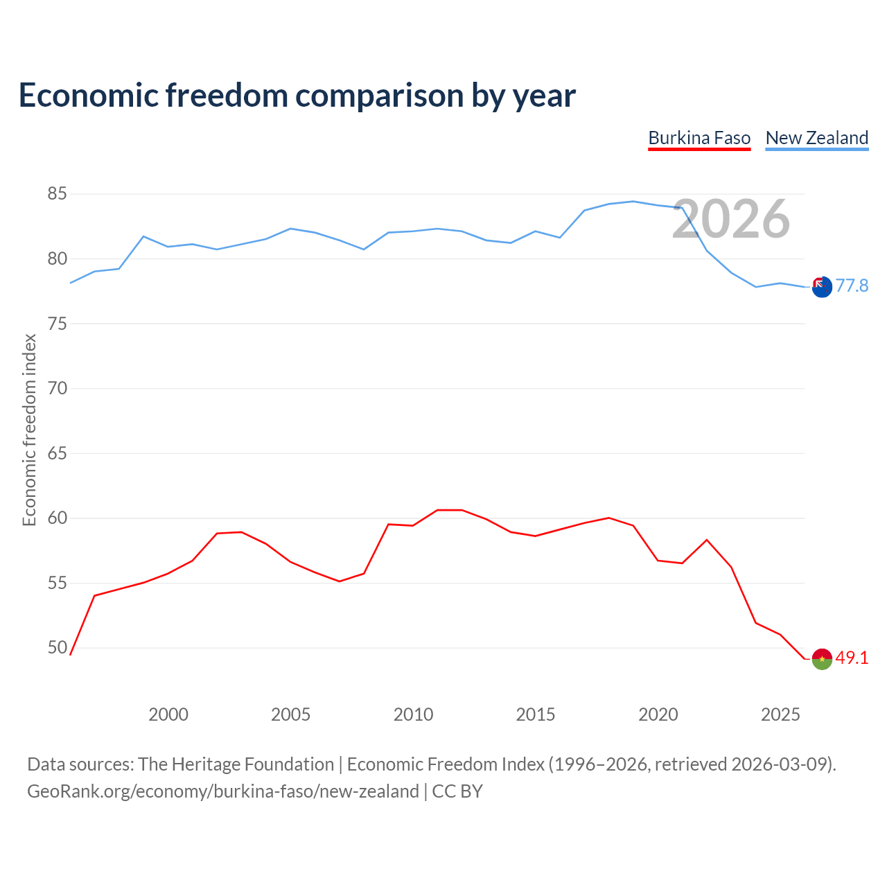 The Economic Freedom Index for Burkina Faso is 49.1, ranking 167/197, compared to 77.8 for New Zealand, ranking 13/197. The chart above displays a comparison of annual changes in economic freedom indexes.