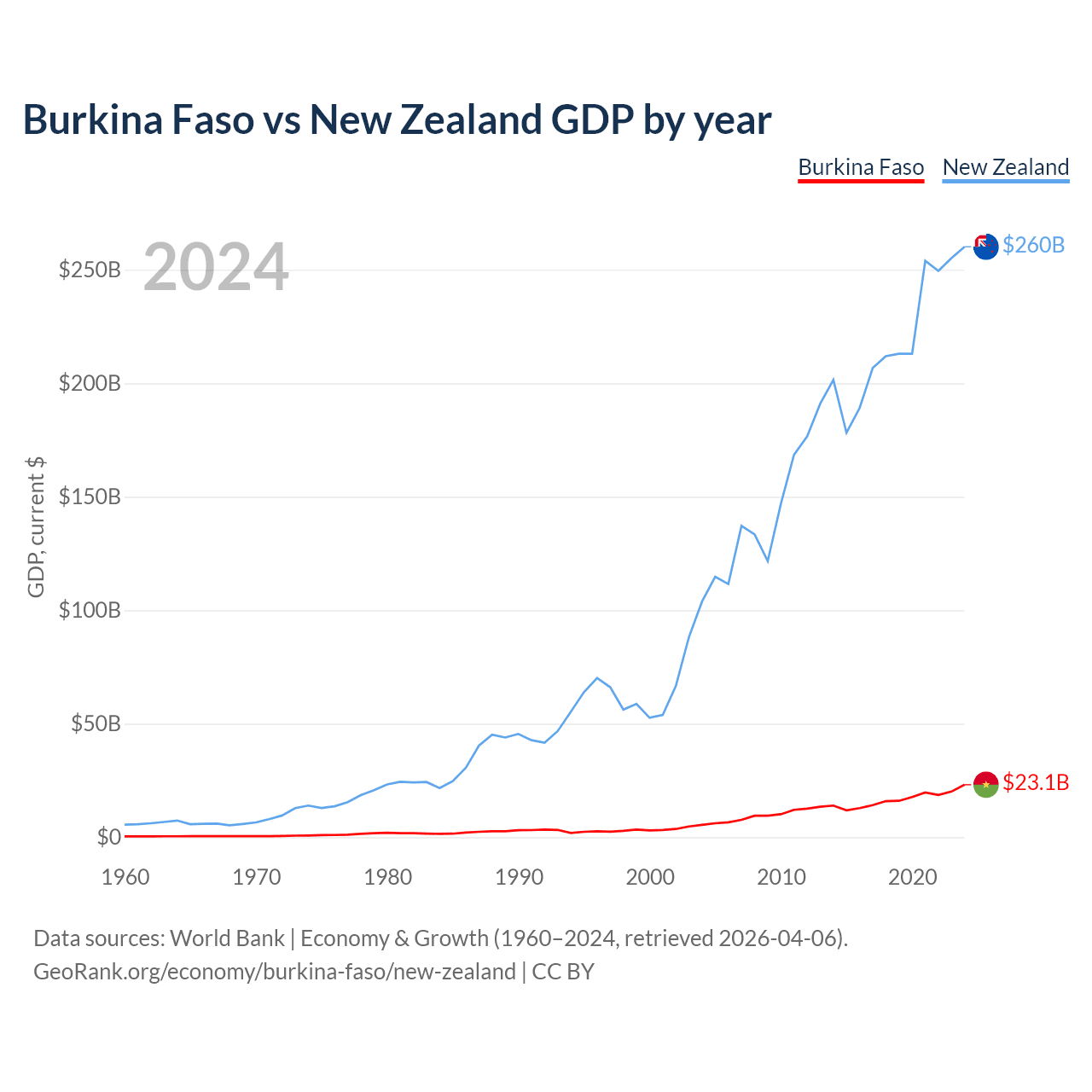 Burkina Faso vs New Zealand GDP by year