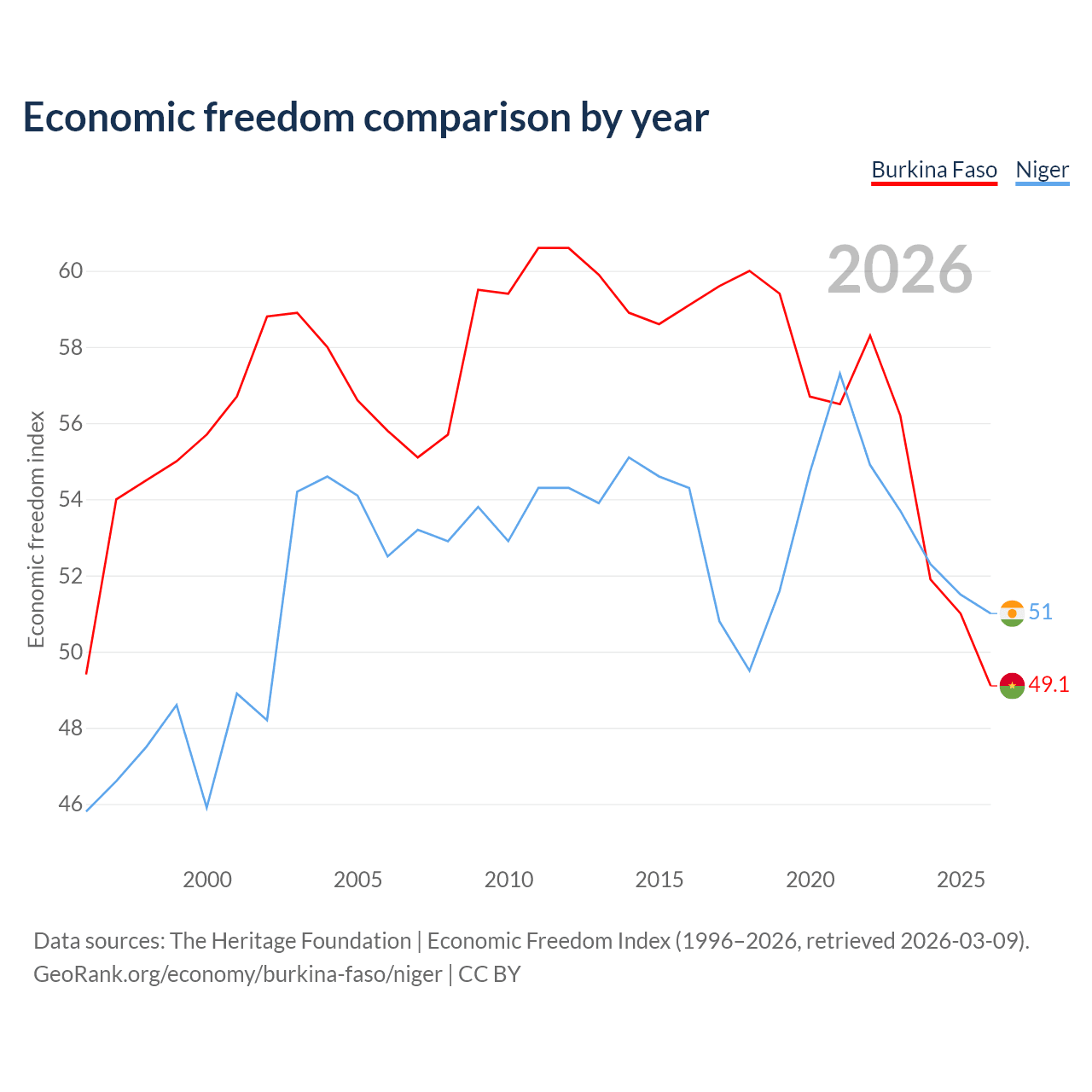 The Economic Freedom Index for Burkina Faso is 49.1, ranking 167/197, compared to 51 for Niger, ranking 156/197. The chart above displays a comparison of annual changes in economic freedom indexes.