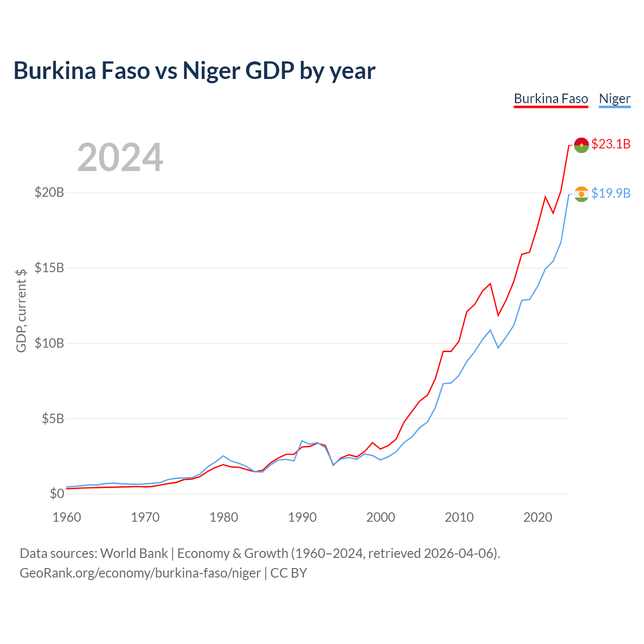 Burkina Faso has a GDP of $23.1B compared to $19.9B for Niger, ranking 122/197 and 130/197 by economy size, respectively.