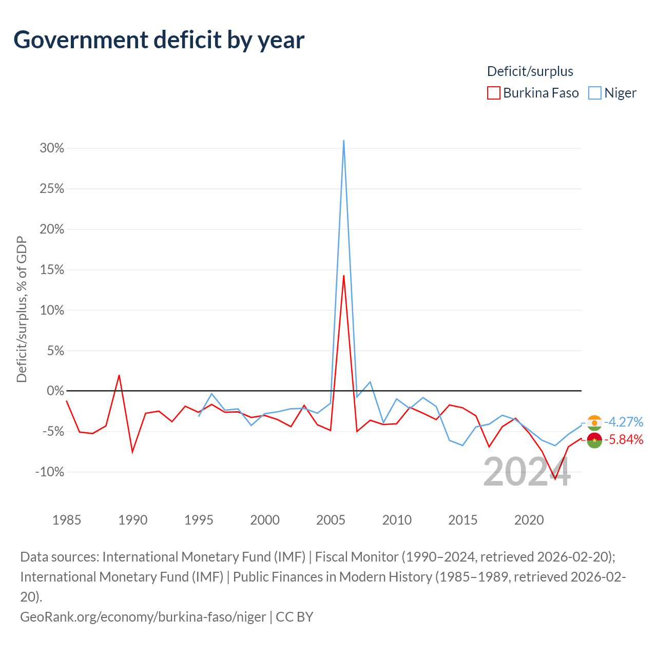 Burkina Faso has $13.2B in government debt (57.2% of GDP), compared to $9.39B (47.2% of GDP) in Niger.