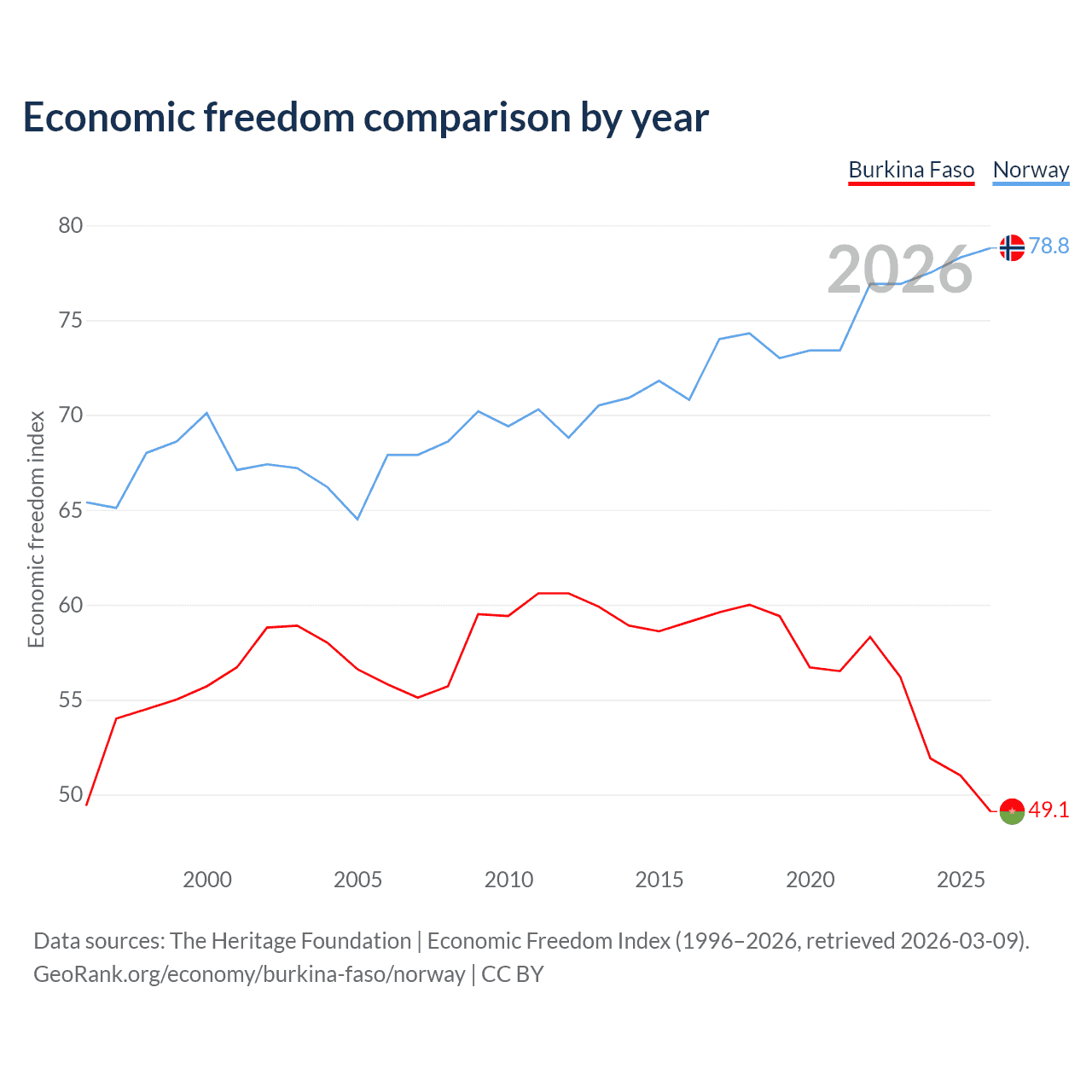 The Economic Freedom Index for Burkina Faso is 49.1, ranking 167/197, compared to 78.8 for Norway, ranking 9/197. The chart above displays a comparison of annual changes in economic freedom indexes.