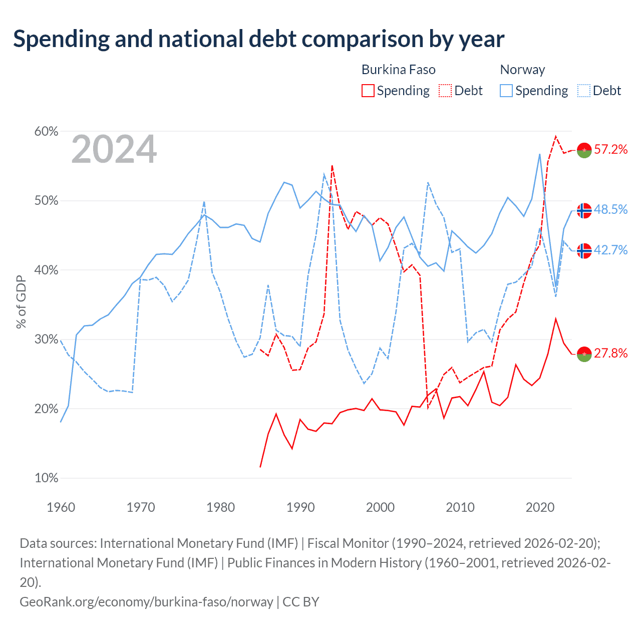 Burkina Faso has $13.2B in government debt (57.2% of GDP), compared to $207B (42.7% of GDP) in Norway.