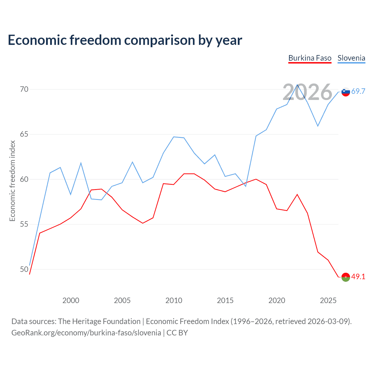 The Economic Freedom Index for Burkina Faso is 49.1, ranking 167/197, compared to 69.7 for Slovenia, ranking 40/197. The chart above displays a comparison of annual changes in economic freedom indexes.