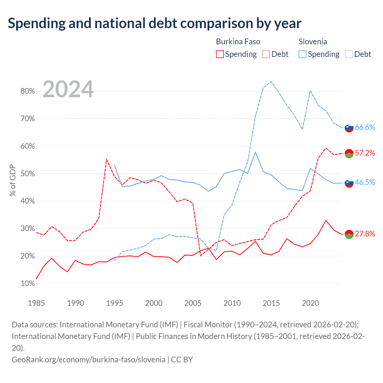 Burkina Faso has $13.2B in government debt (57.2% of GDP), compared to $48.6B (66.6% of GDP) in Slovenia.
