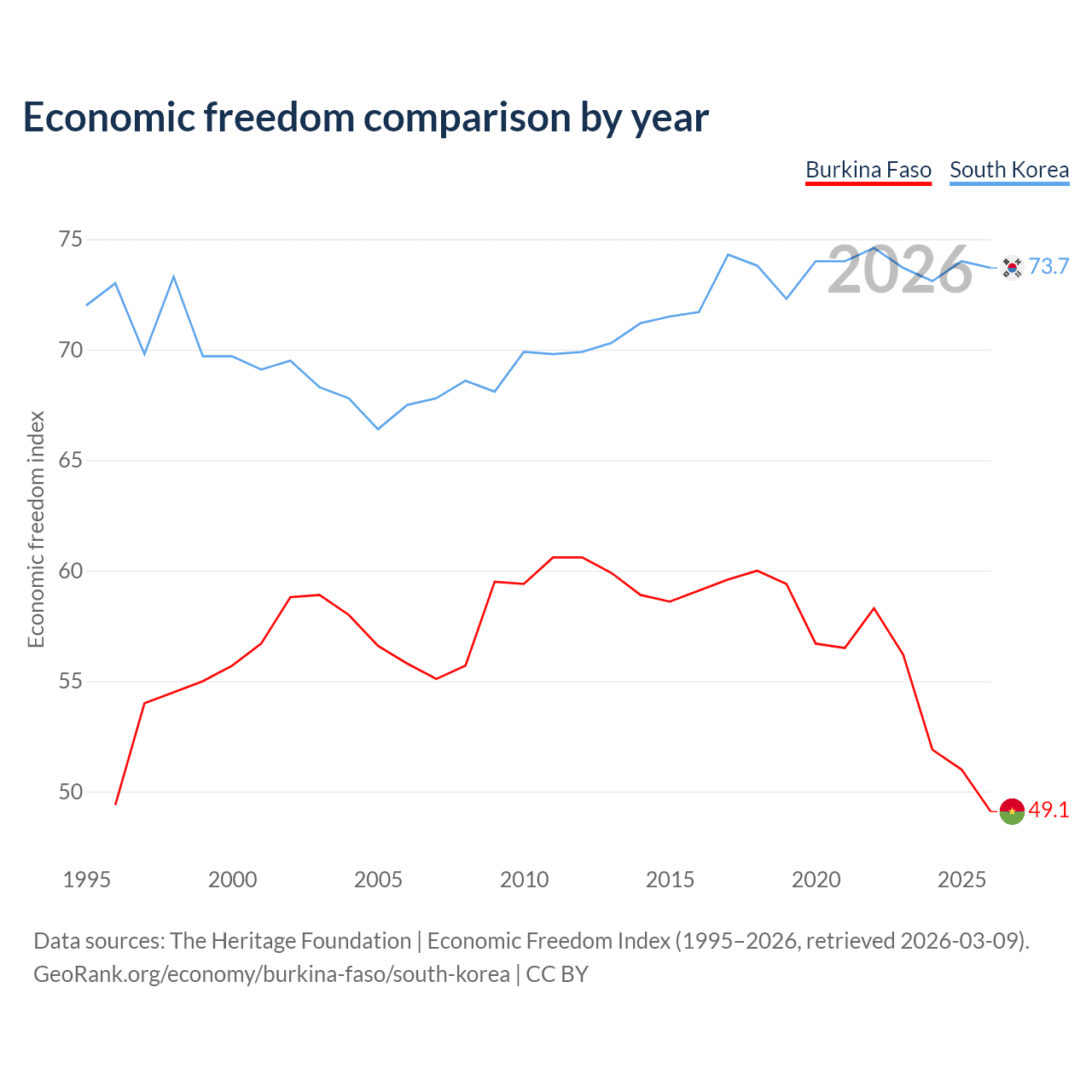 The Economic Freedom Index for Burkina Faso is 49.1, ranking 167/197, compared to 73.7 for South Korea, ranking 24/197. The chart above displays a comparison of annual changes in economic freedom indexes.